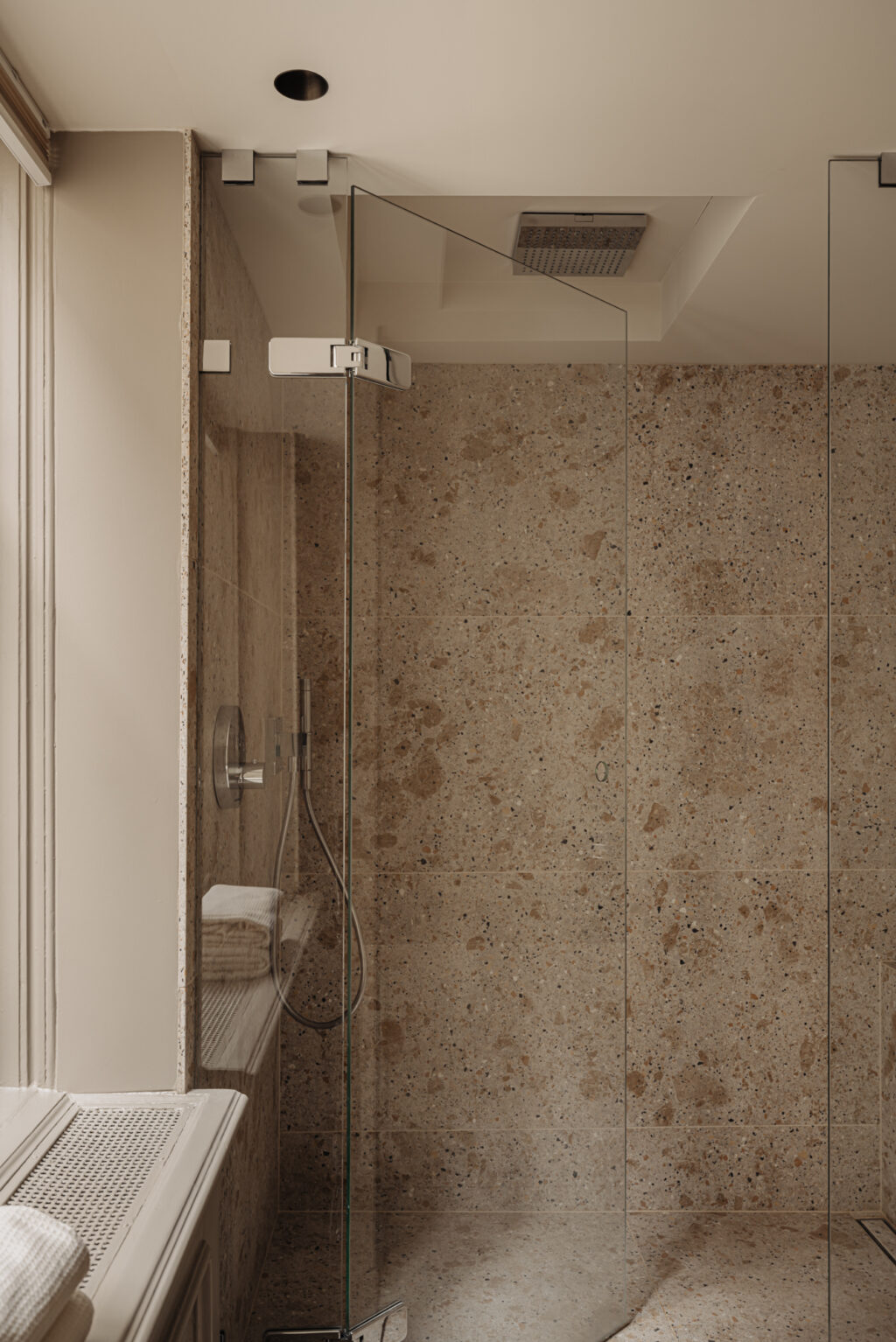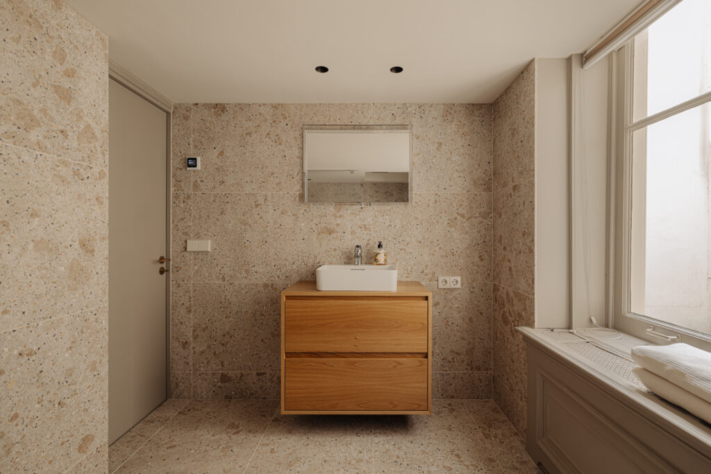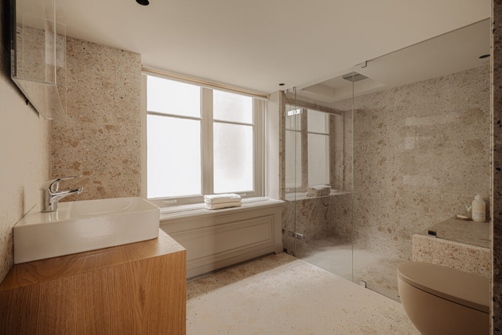 De onder architectuur gerealiseerde badkamer is voorzien van een inloopdouche, wastafel en toilet. Deze badkamer is niet alleen functioneel, maar ook stijlvol ontworpen, passend bij het karakter van het appartement.