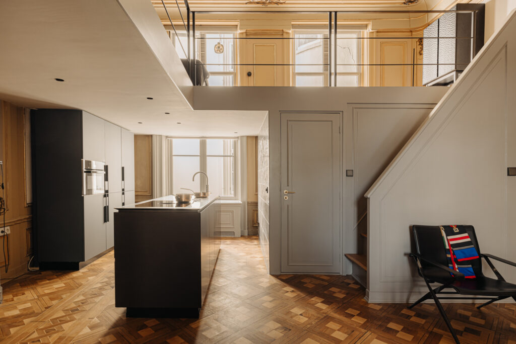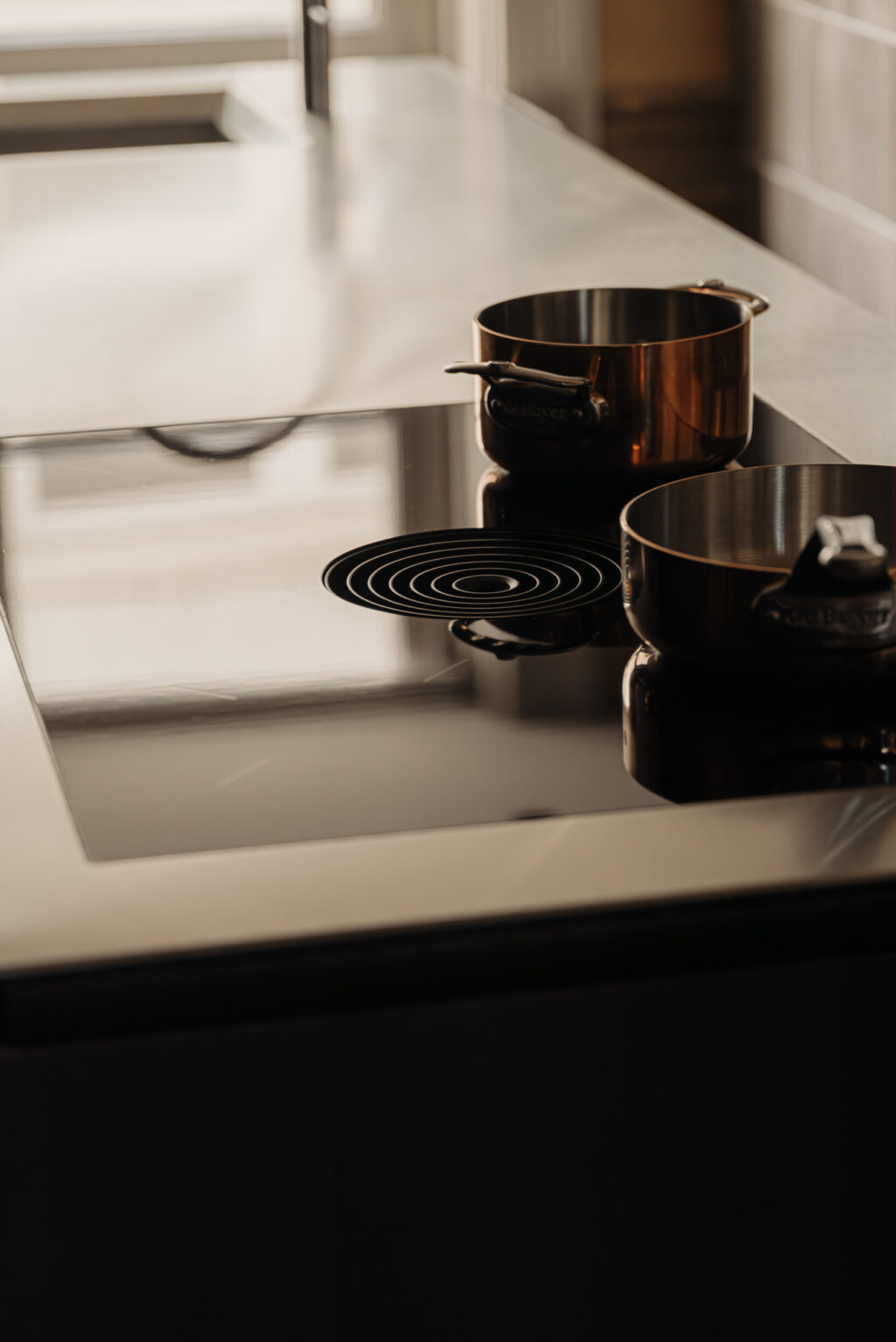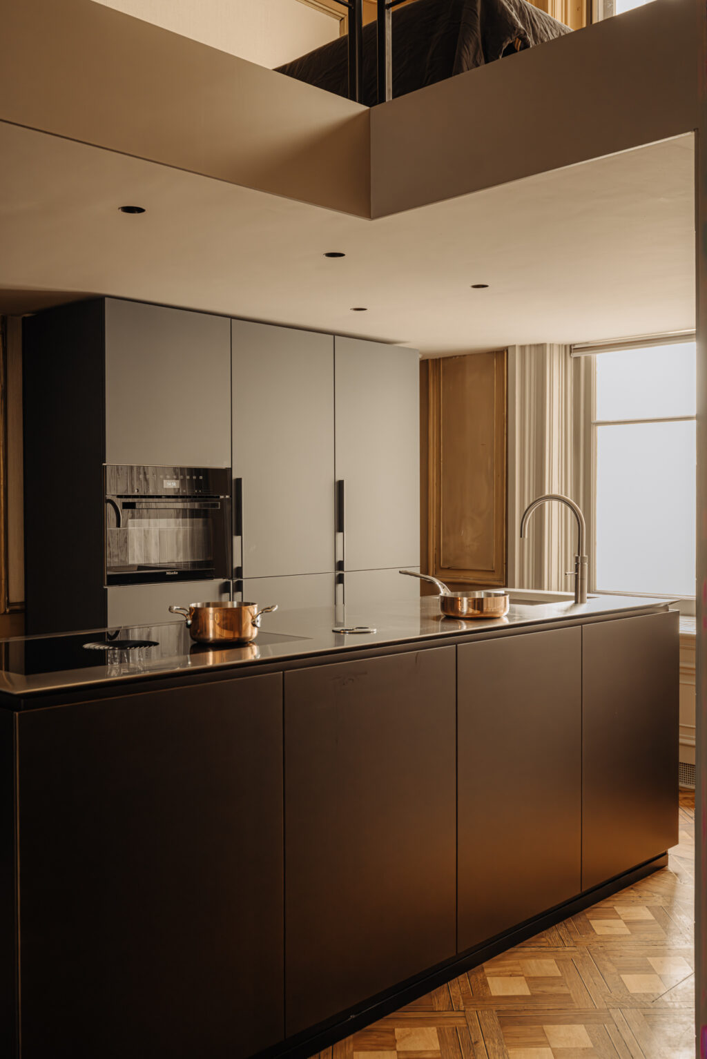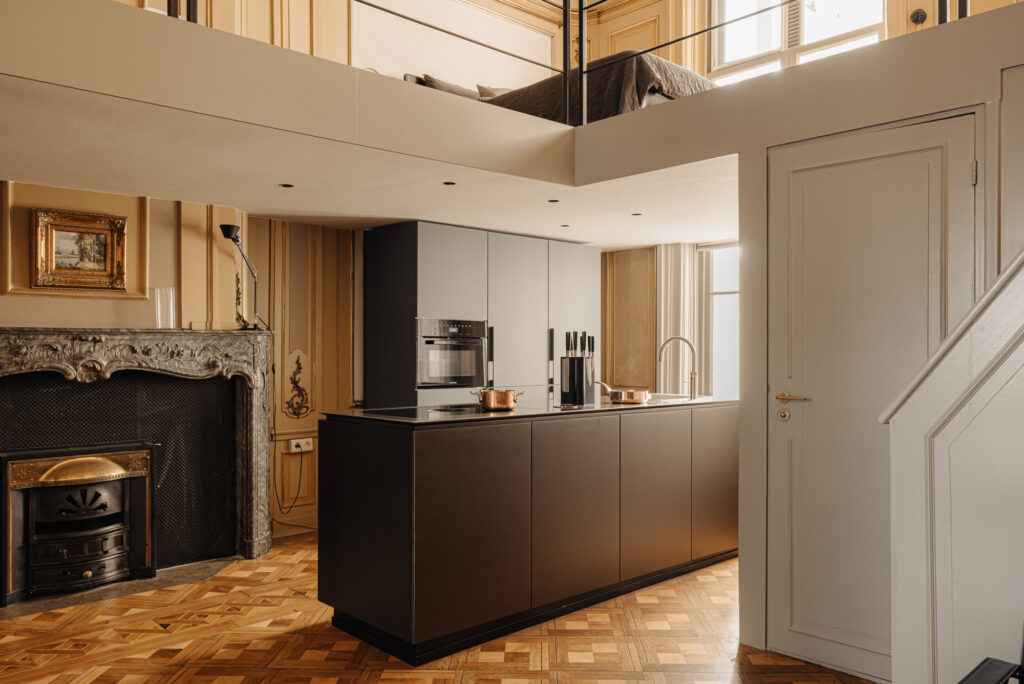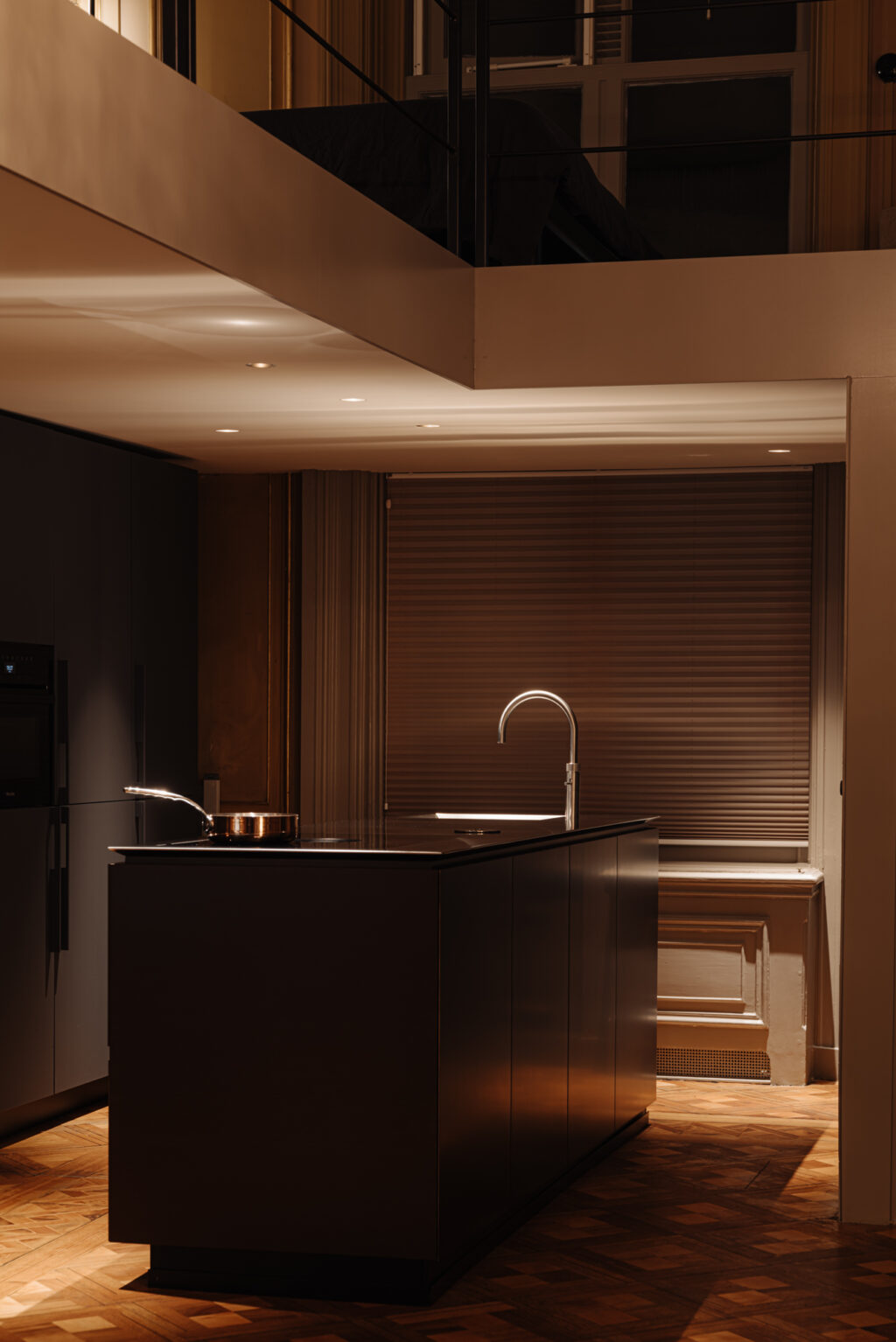 Aan de achterzijde van het appartement bevindt zich een open keuken en badkamer, ontworpen volgens een architectonisch concept. De op maat gemaakte keuken is uitgerust met hoogwaardige Miele inbouwapparatuur, waaronder een koel-/vriescombinatie, combimagnetron en vaatwasser. Bovendien beschikt de keuken over een inductiekookplaat van BORA, voorzien van een geïntegreerd afzuigsysteem, wat zorgt voor een naadloze en moderne kookervaring.