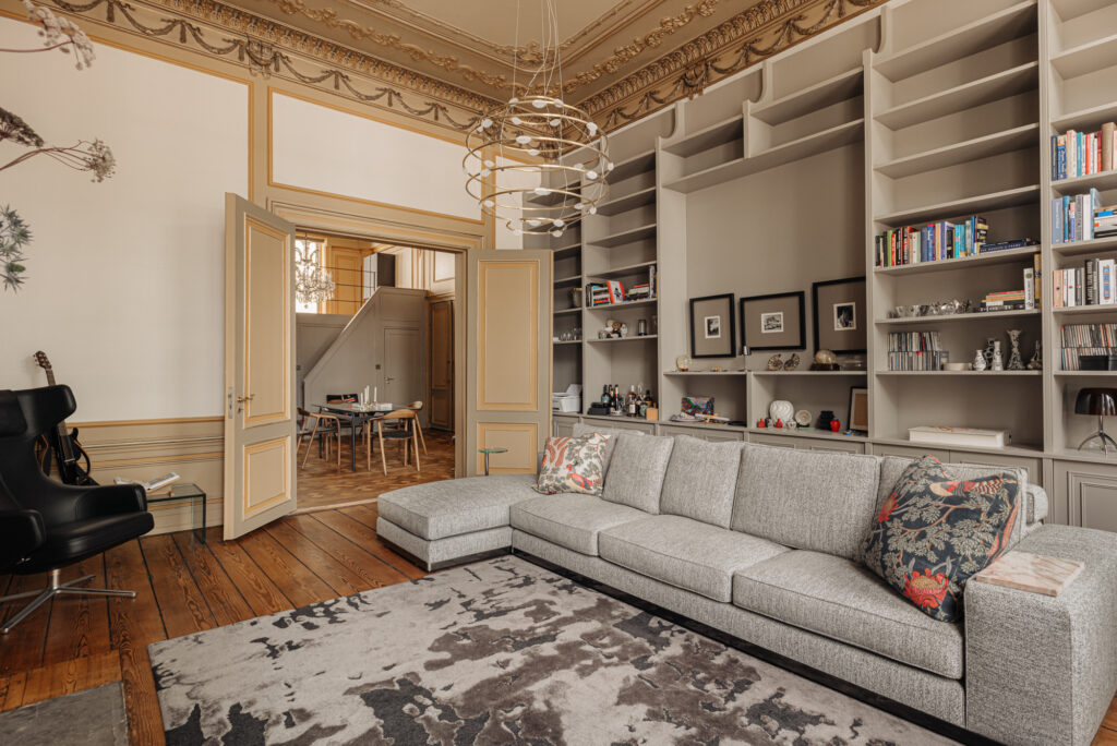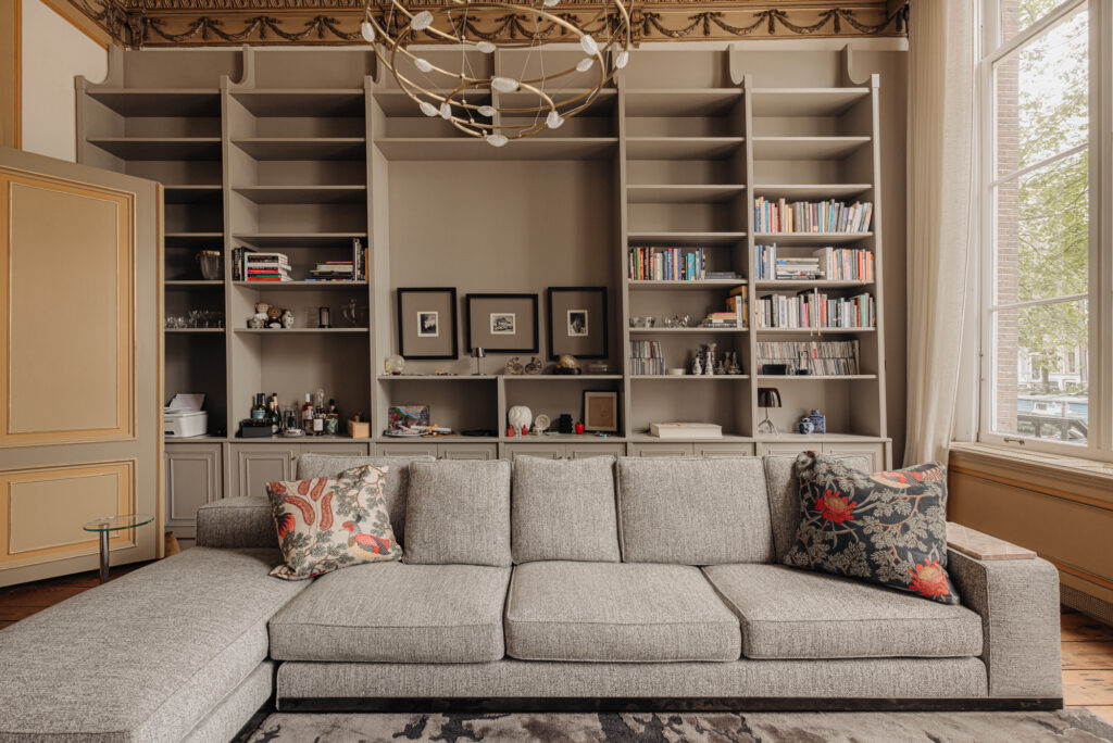 Het appartement bestaat uit twee prachtige stijlkamers met indrukwekkende plafondhoogtes van 4,5 meter. De originele houten vloeren, lambrisering, geornamenteerde plafonds en marmeren schouwen zijn allemaal in uitstekende staat en dragen bij aan de tijdloze elegantie van de ruimte. Aan de grachtzijde bevindt zich een fraaie zitkamer met een originele schouw met haard. Deze ruimte is op smaakvolle wijze ingericht met een grote boekenkast die harmonieus samengaat met de originele lambrisering en plafonds. Vanuit deze kamer kunt u genieten van een prachtig uitzicht op de gracht.