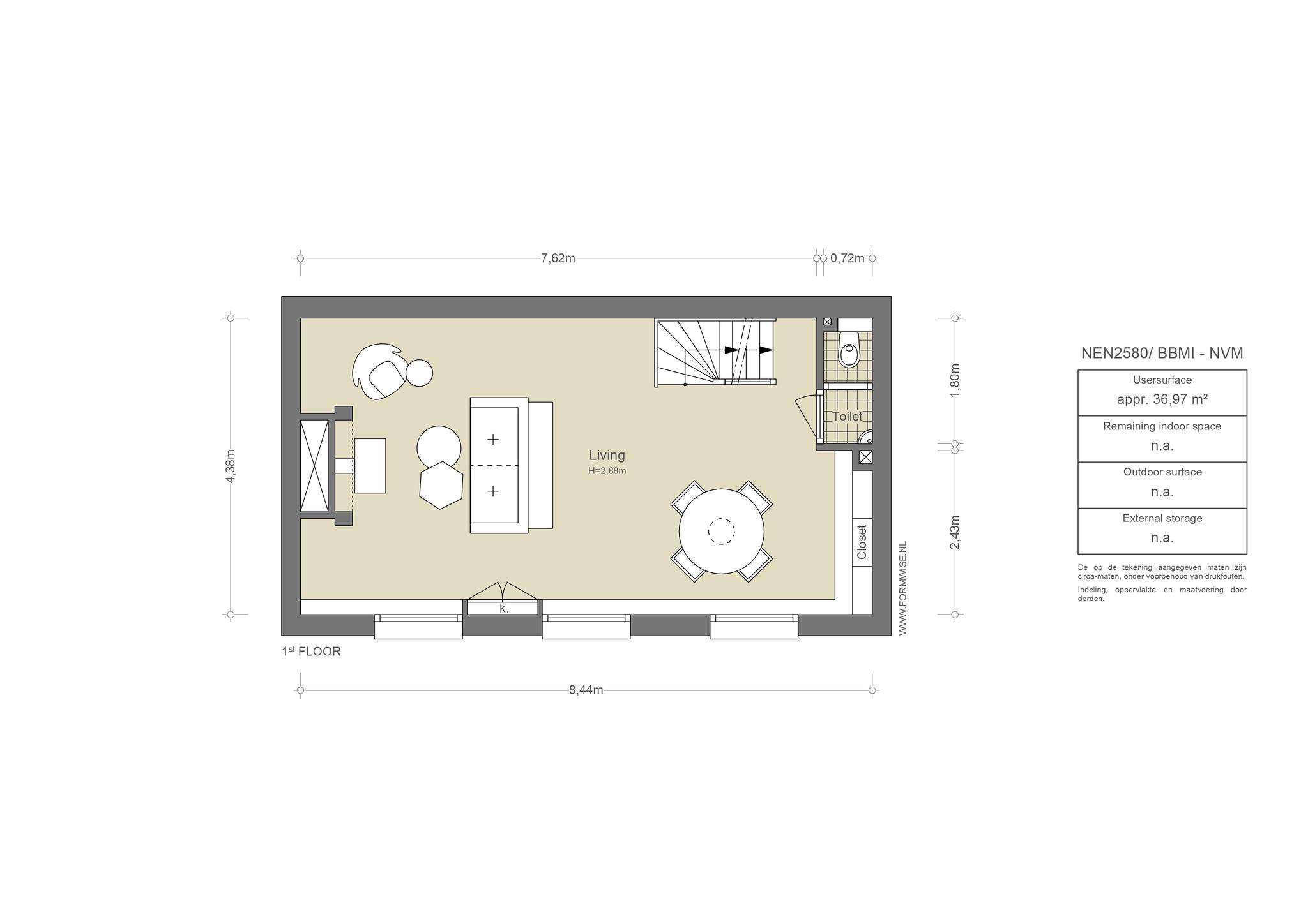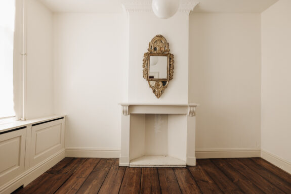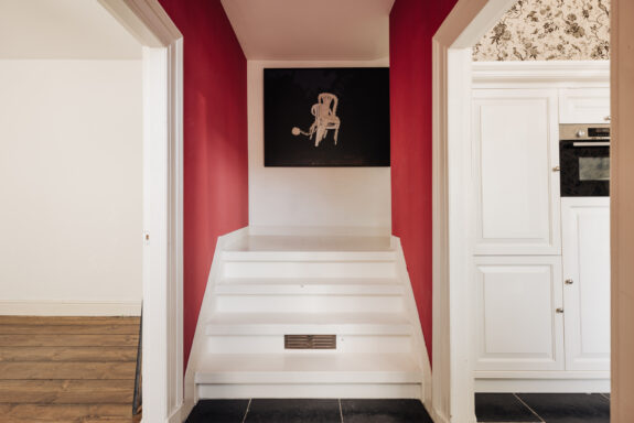 The living room features an old floor with wide planks and a beautiful square (Carré) format. A mantel in this room adds a historical and charming element, making it a pleasant space. With a width of nearly 10 meters on the canal and three windows, the living area on the first floor offers an impressive view of the lock complex and even Carré. The beamed ceiling and wood stove make this a cozy space. The old wide floorboards have been restored here as well, and the beautiful mantel emphasizes the historical character of the house. Together, the kitchen and living room create a living and cooking area that is both functional and atmospheric, with a perfect balance between historical charm and modern amenities.
