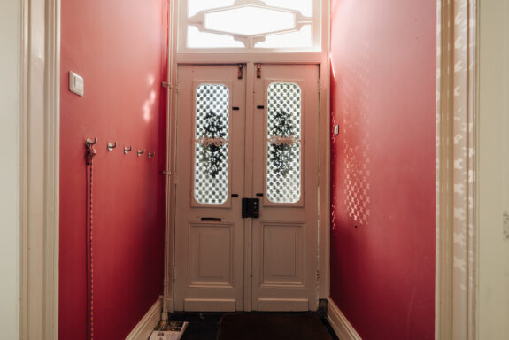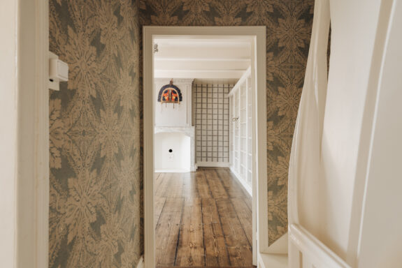 The door frame, door, and transom date from the mid-20th century. These elements add a modern touch to the 17th-century character of the building without detracting from its historical appearance. The carefully designed door frame complements the rest of the building well, while the door and transom are subtle modern additions.