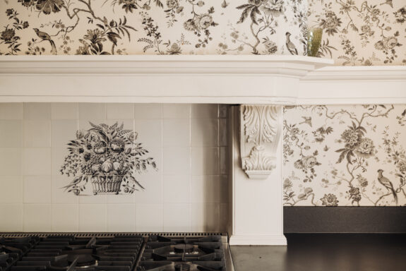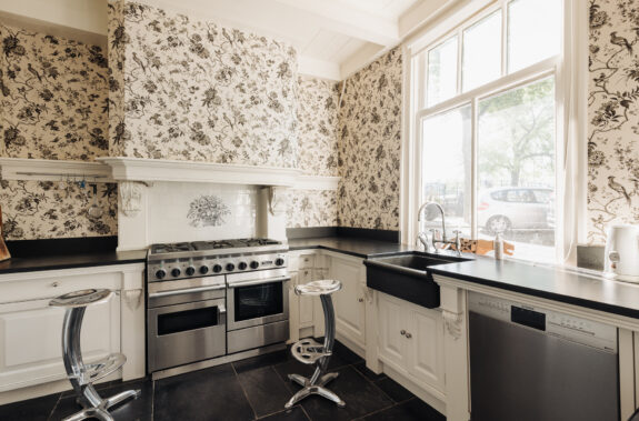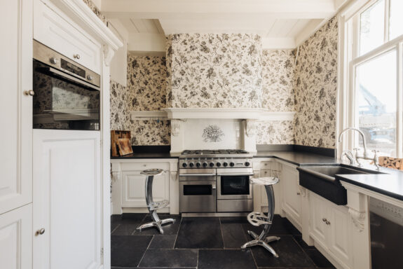 The stylish kitchen features a black-and-white design and includes a large pantry that descends a few steps. This is ideal for storage and supplies. The robust Falcon professional stove with five burners makes cooking here a pleasure. There is a separate dining area with a mantel and space for a large dining table.