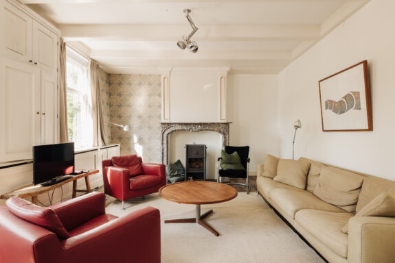 De woonkamer beslaat de gehele breedte van het pand en is de favoriete plek van de huidige bewoners. De vele ramen en de ligging op het zuiden maken het een lichte kamer. Authentieke balken, de vloer en een marmeren schouw accentueren het karakter van het grachtenpand. Er is een separaat toilet.