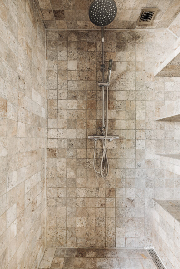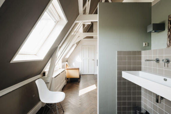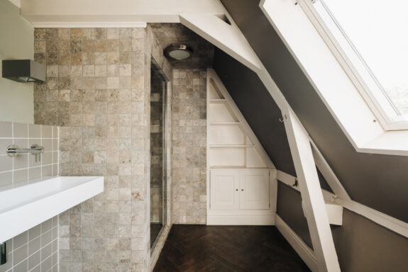 The charming attic is the quietest space in the house. It includes a walk-in closet and a semi-open bathroom with a double sink, walk-in shower, and custom-built cabinetry. The herringbone floor adds to the cohesive design. Additional light comes from two Velux windows and a dormer, making the space bright and inviting.