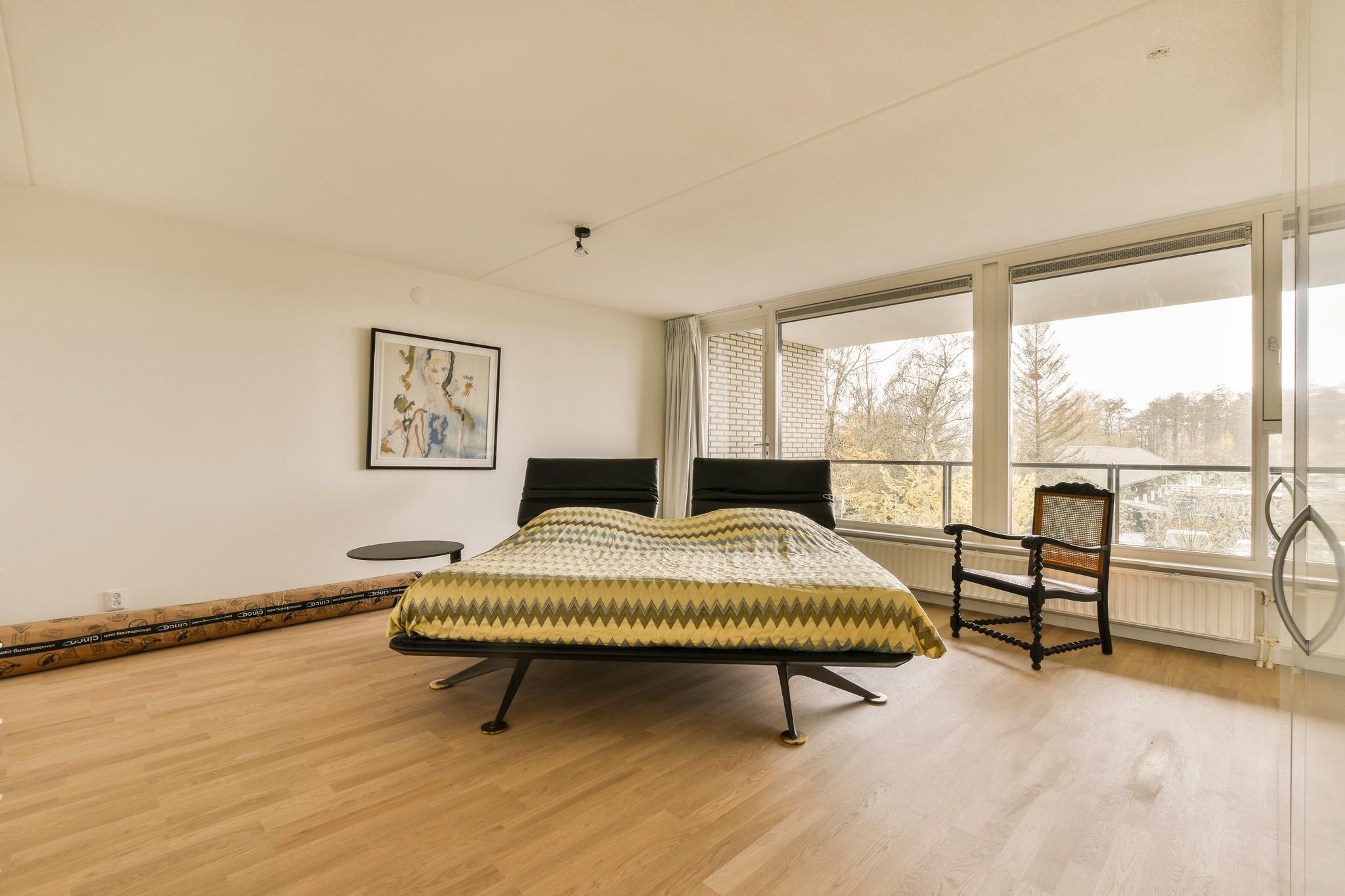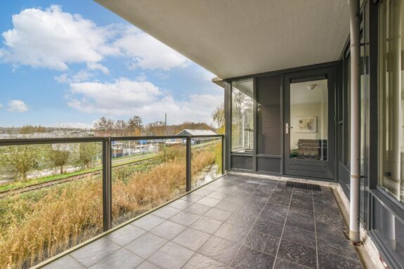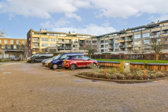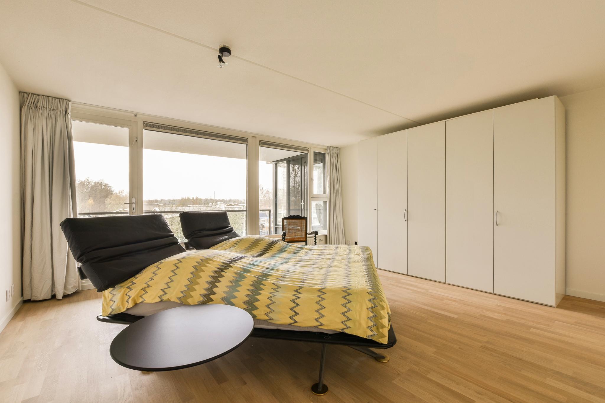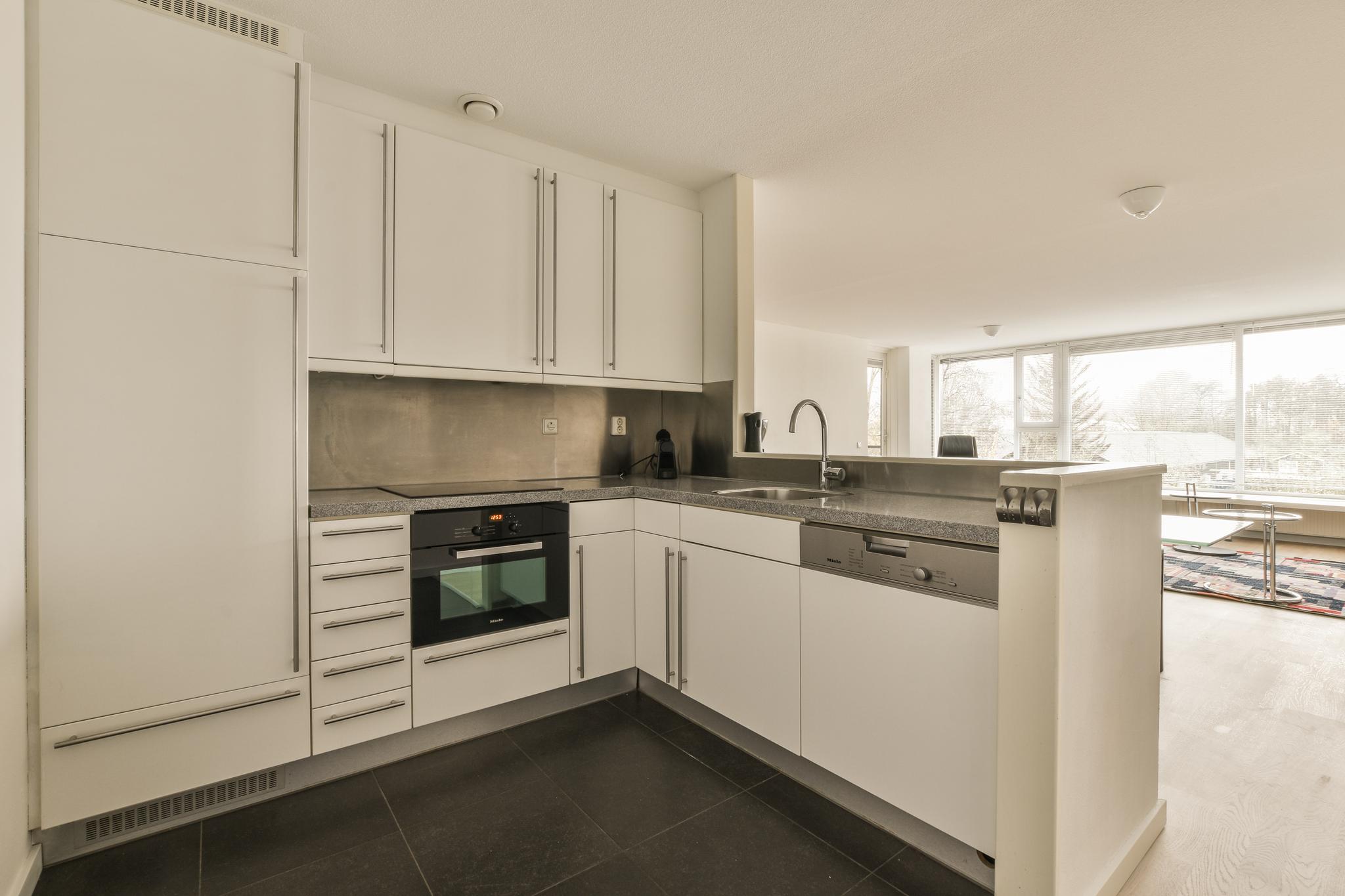 De half open keuken heeft een hardstenen werkblad, vijf-pits gasfornuis en is voorzien van diverse inbouwapparatuur. Een fijne plek voor het bereiden van een heerlijke maaltijd. Naast de keuken is er een interne berging met wasmachine- en drogeraansluiting en voldoende opbergruimte. Vanuit de woonkamer is er toegang tot het zonnige balkon wat gelegen is op het westen. Het balkon heeft een prachtig uitzicht over de jachthavens van de Nieuwe Meer en het Amsterdamse Bos.
