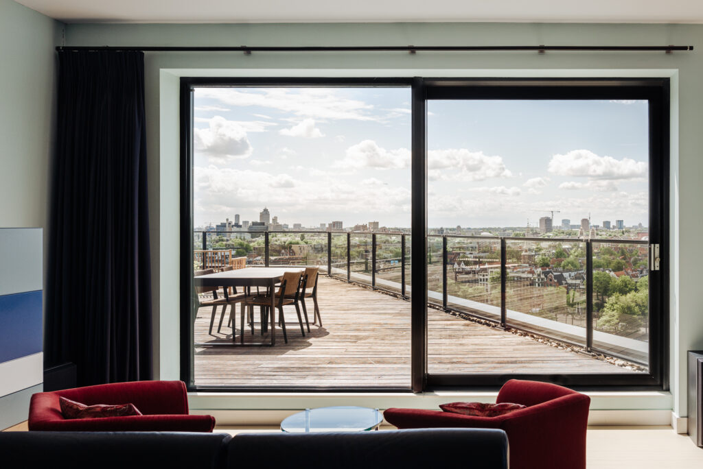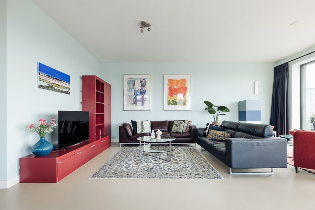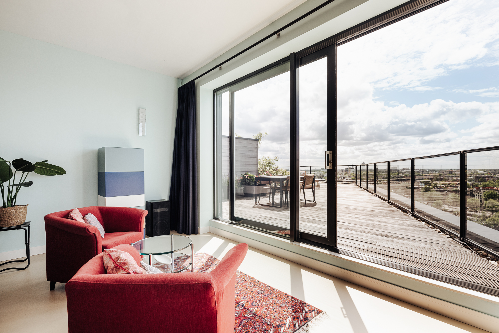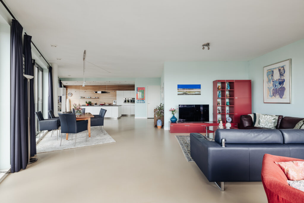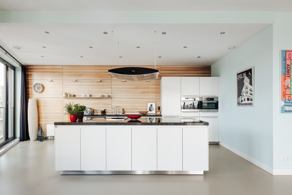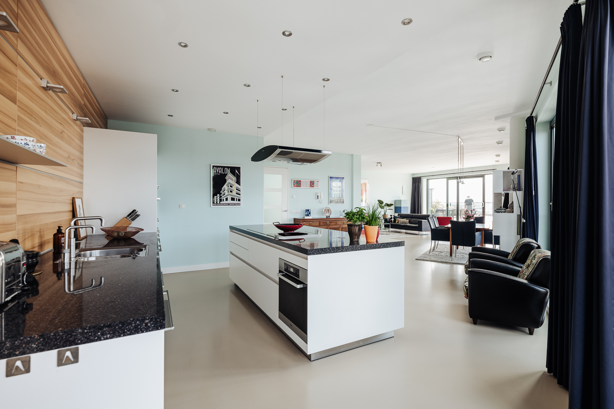 Overloop met toilet. Binnenkomst in de woonkamer met open keuken. Bij binnenkomst krijg je direct de WOW factor door het fantastische uitzicht op de haven en het uitzicht over de stad. De Bulthaup woonkeuken is voorzien van een kookeiland met een inductiekookplaat inclusief wok en een oven. Aan de wand is er een rechte opstelling die plaats biedt aan een wijnklimaatkast, Quooker, koelkast, vriezer, afwasmachine, combi oven en een stoomoven. De achterwand van de keuken is gemaakt van appelhout.