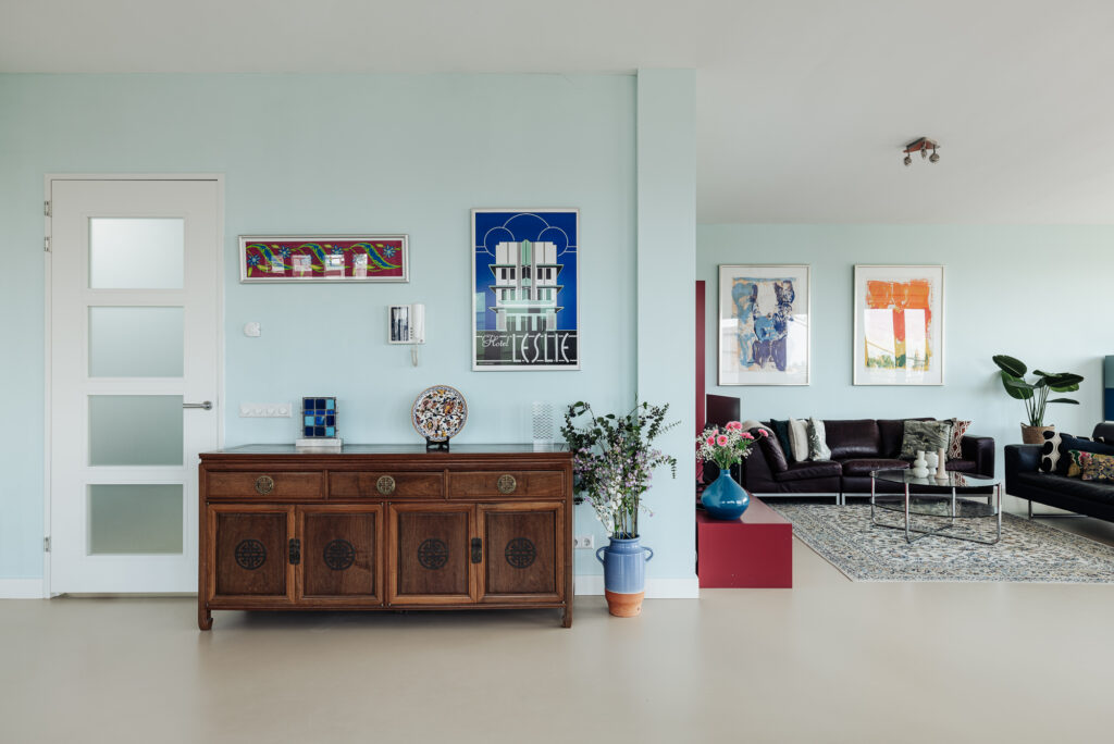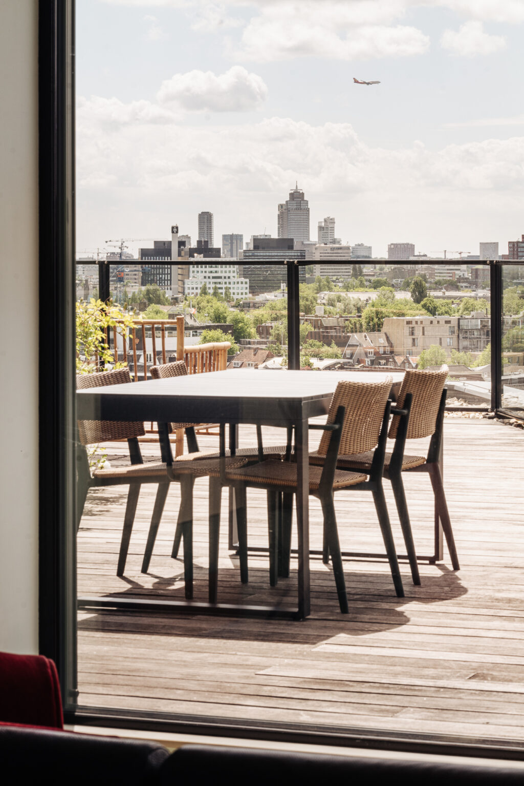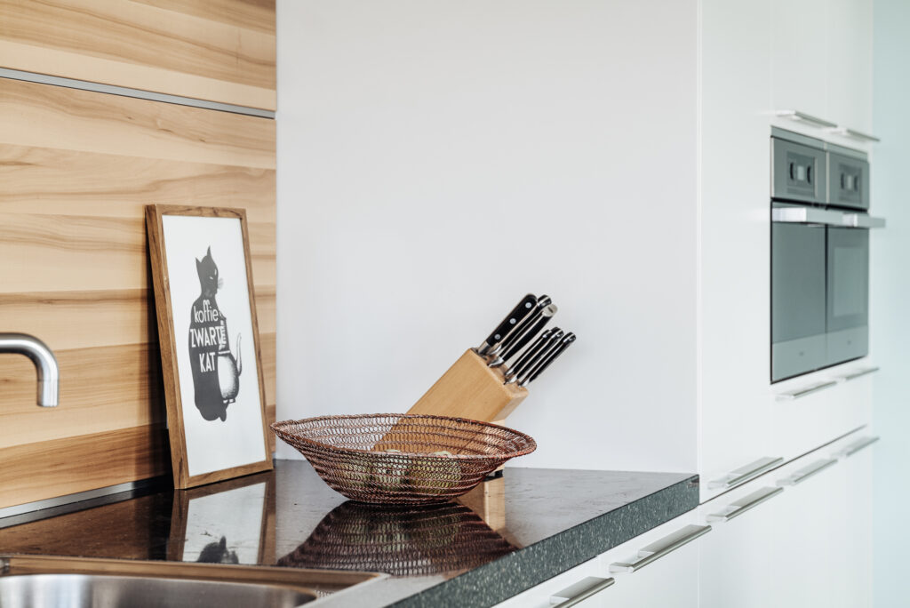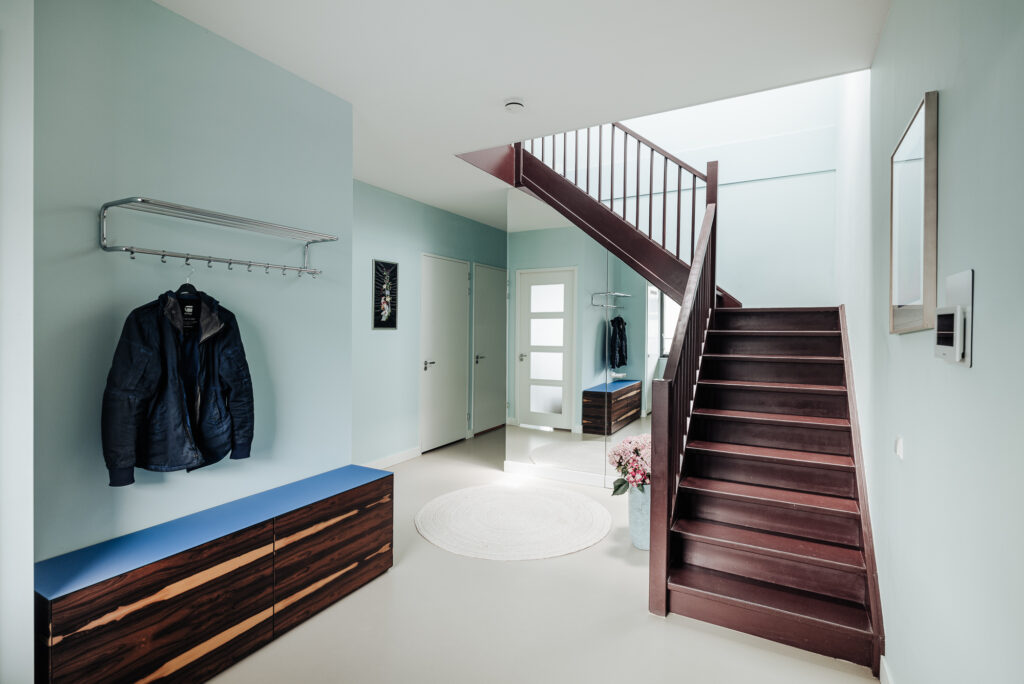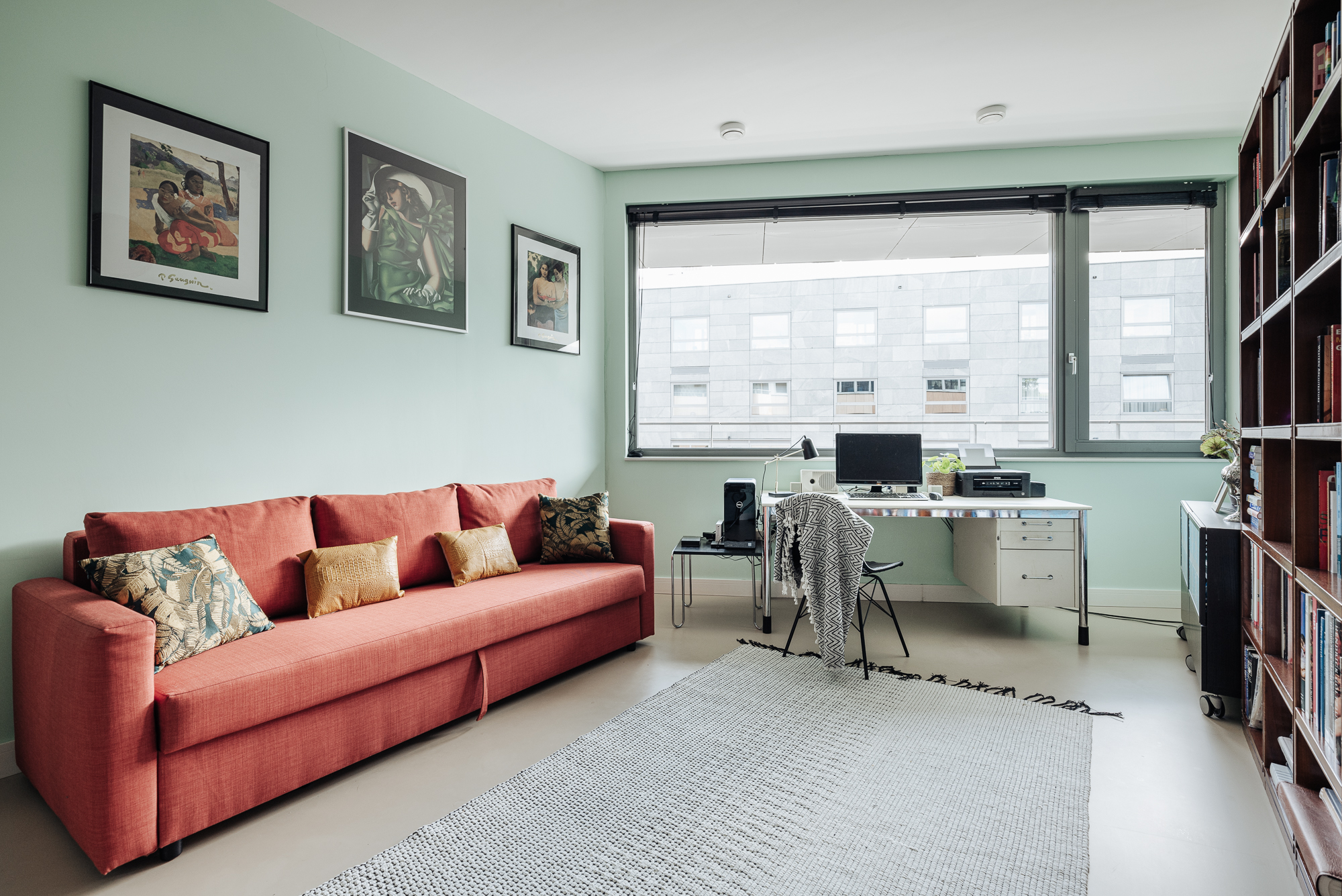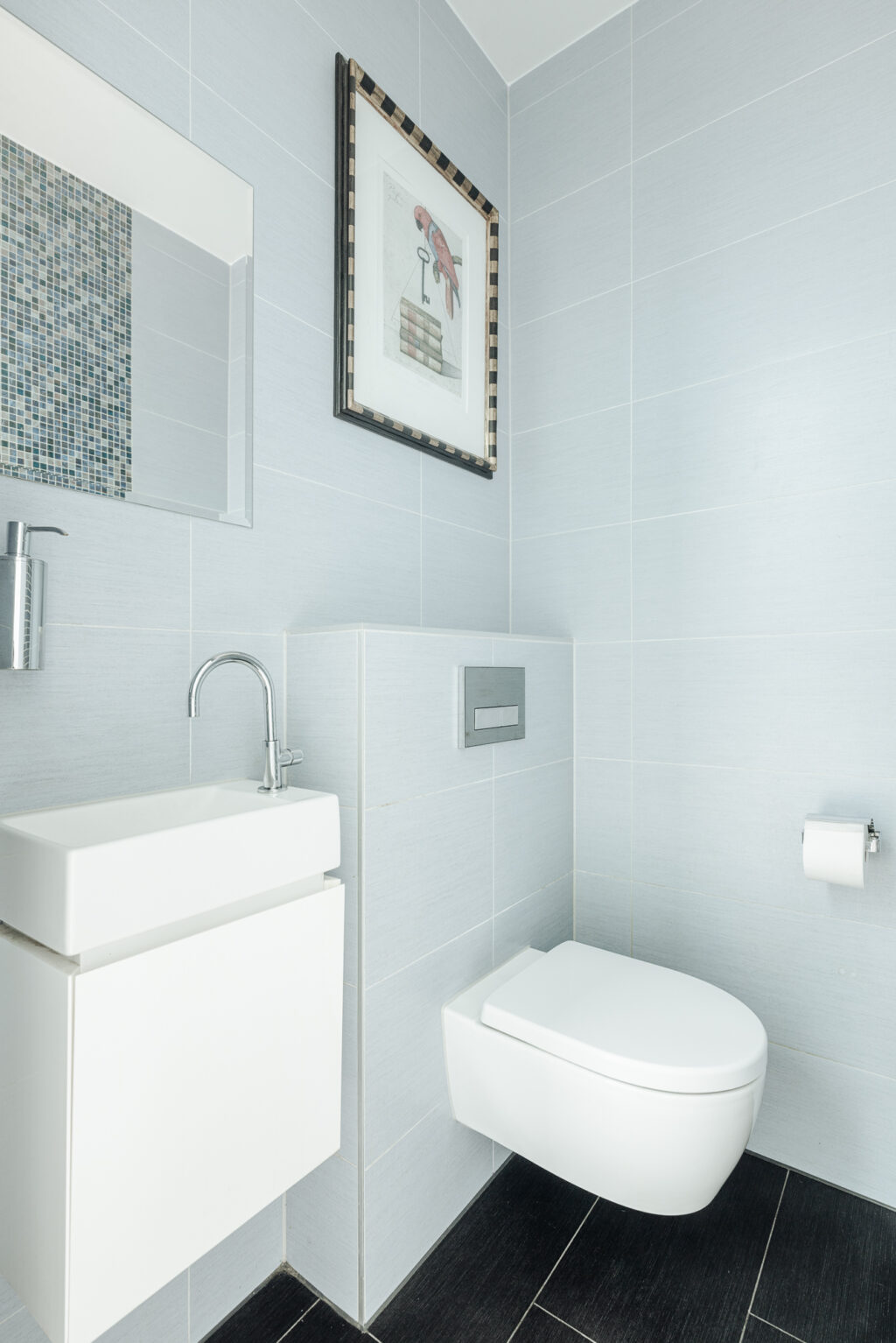 Overloop met toilet. Binnenkomst in de woonkamer met open keuken. Bij binnenkomst krijg je direct de WOW factor door het fantastische uitzicht op de haven en het uitzicht over de stad. De Bulthaup woonkeuken is voorzien van een kookeiland met een inductiekookplaat inclusief wok en een oven. Aan de wand is er een rechte opstelling die plaats biedt aan een wijnklimaatkast, Quooker, koelkast, vriezer, afwasmachine, combi oven en een stoomoven. De achterwand van de keuken is gemaakt van appelhout.