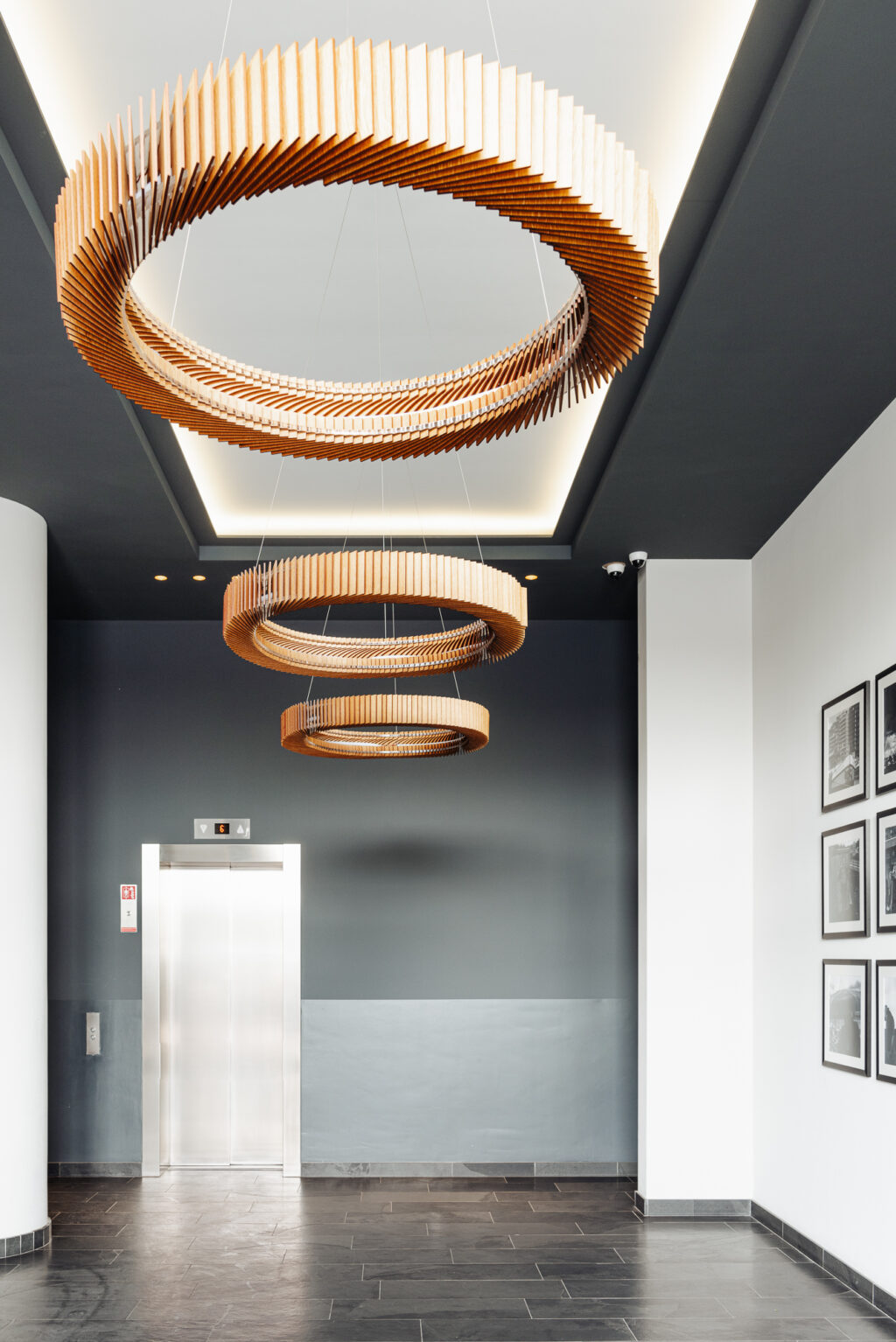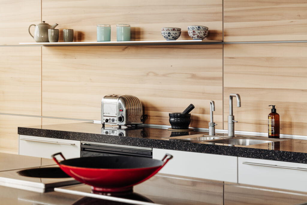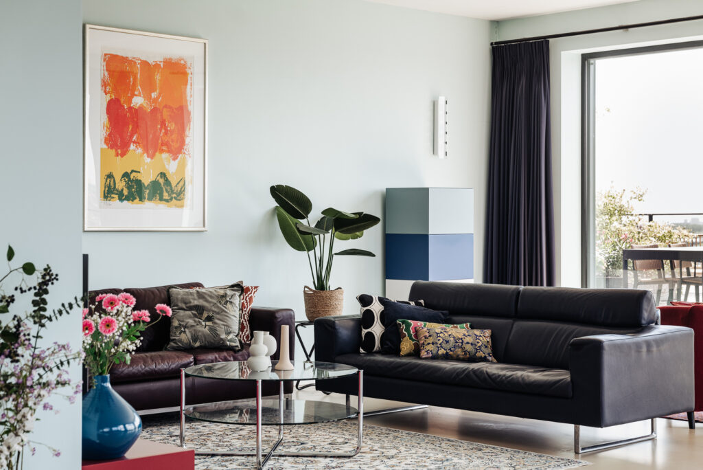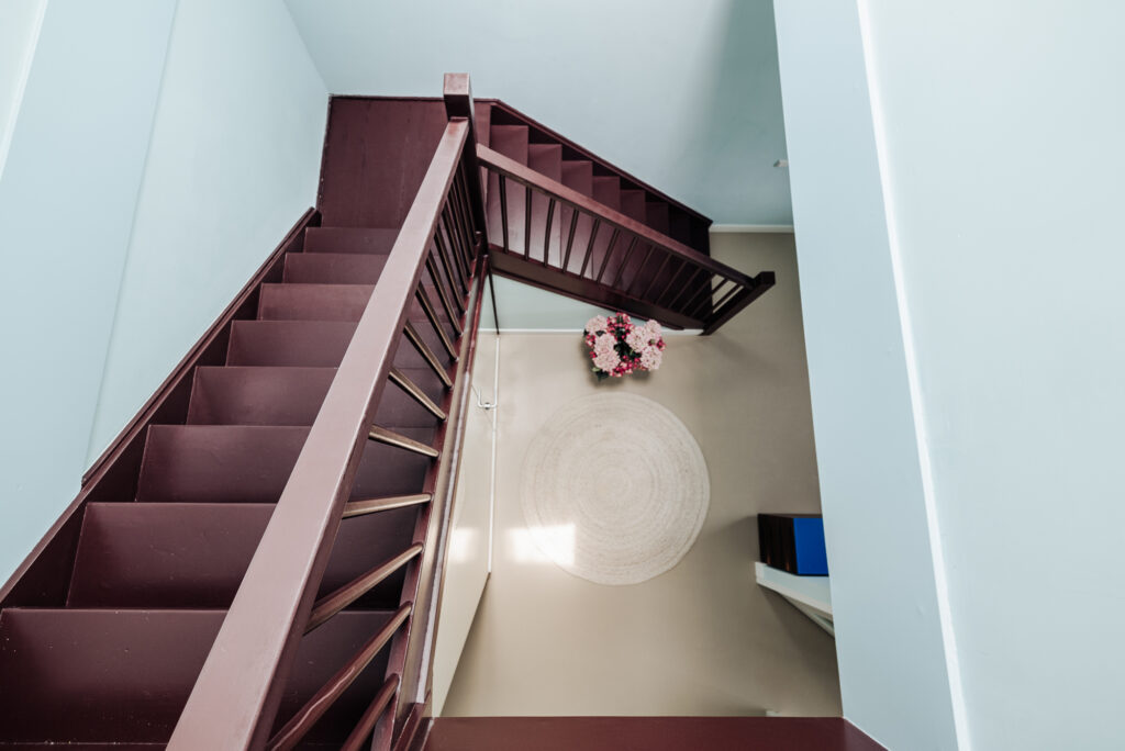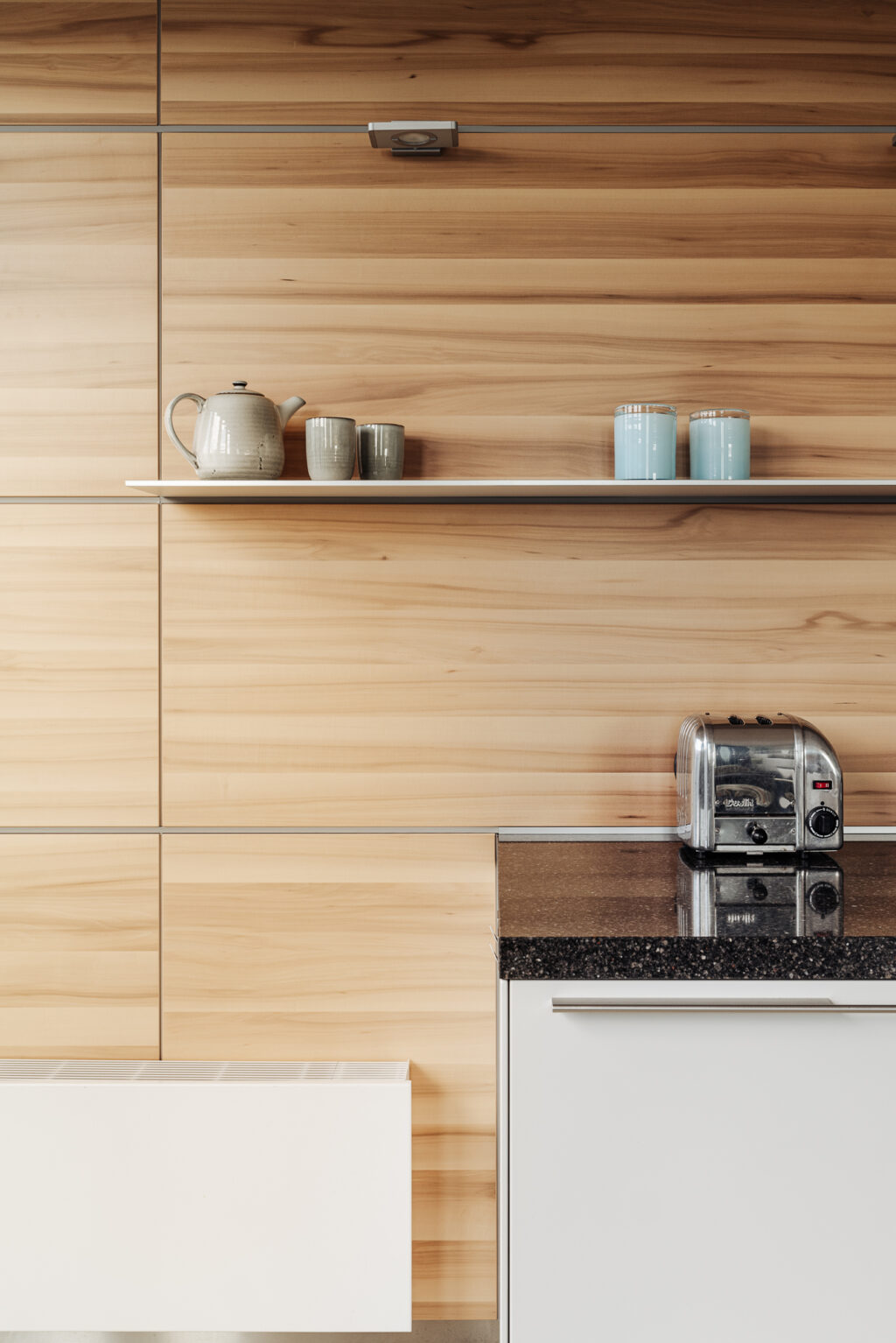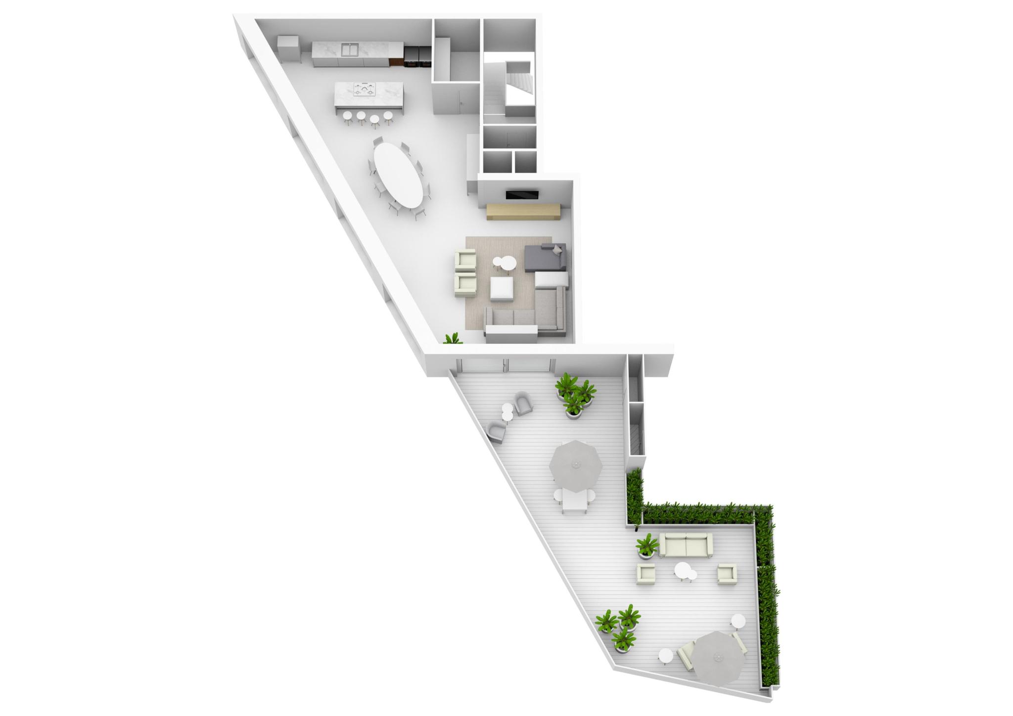 Overloop met toilet. Binnenkomst in de woonkamer met open keuken. Bij binnenkomst krijg je direct de WOW factor door het fantastische uitzicht op de haven en het uitzicht over de stad. De Bulthaup woonkeuken is voorzien van een kookeiland met een inductiekookplaat inclusief wok en een oven. Aan de wand is er een rechte opstelling die plaats biedt aan een wijnklimaatkast, Quooker, koelkast, vriezer, afwasmachine, combi oven en een stoomoven. De achterwand van de keuken is gemaakt van appelhout.