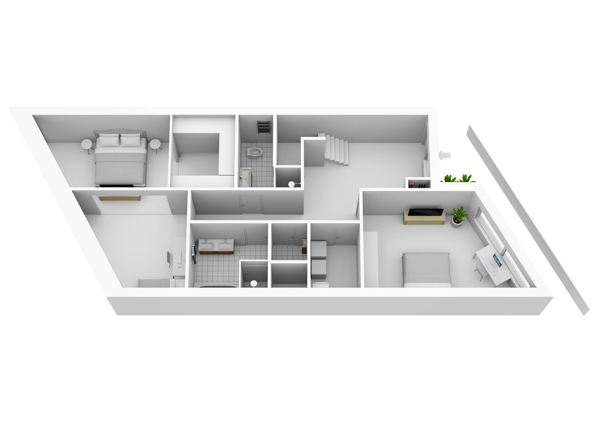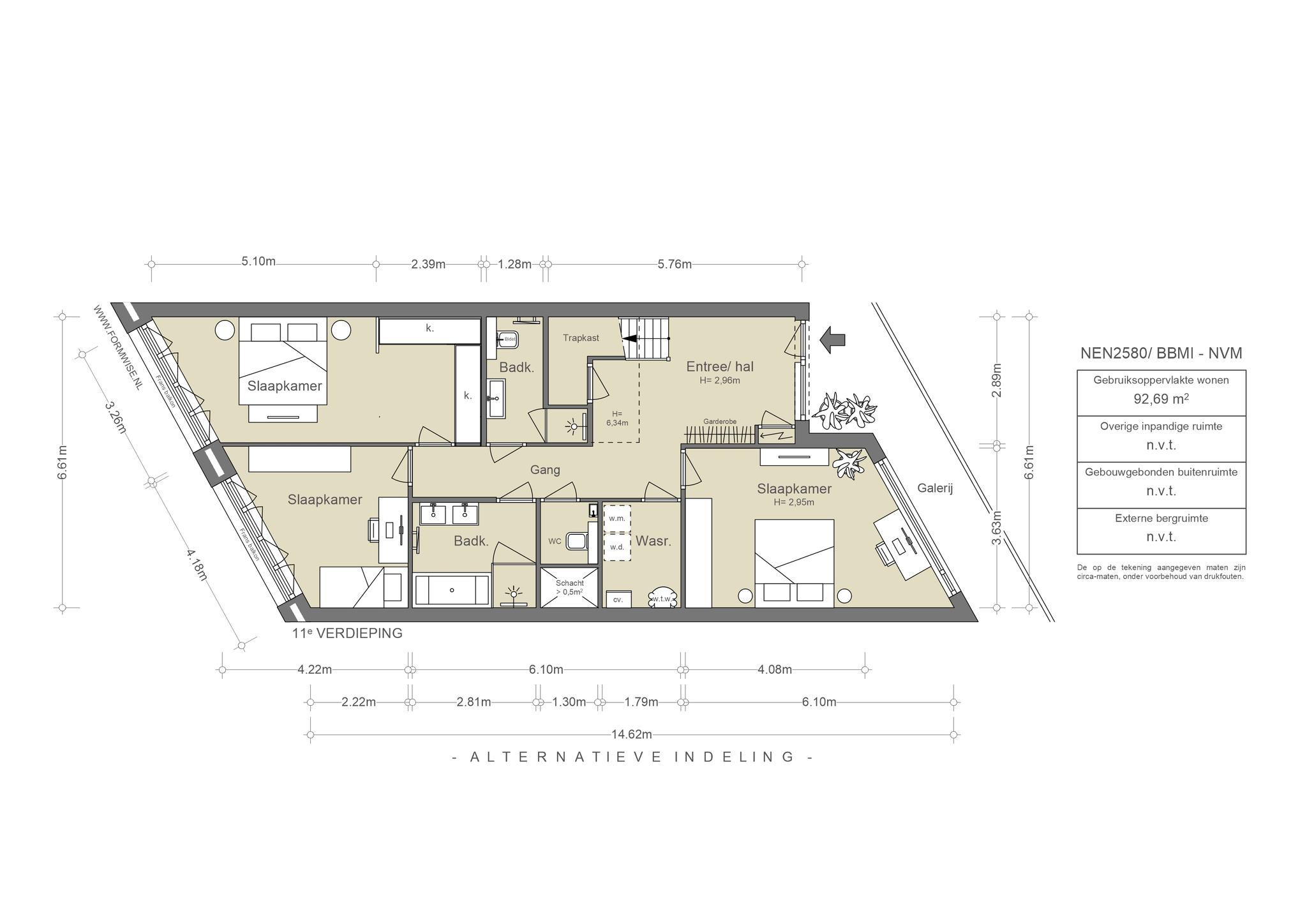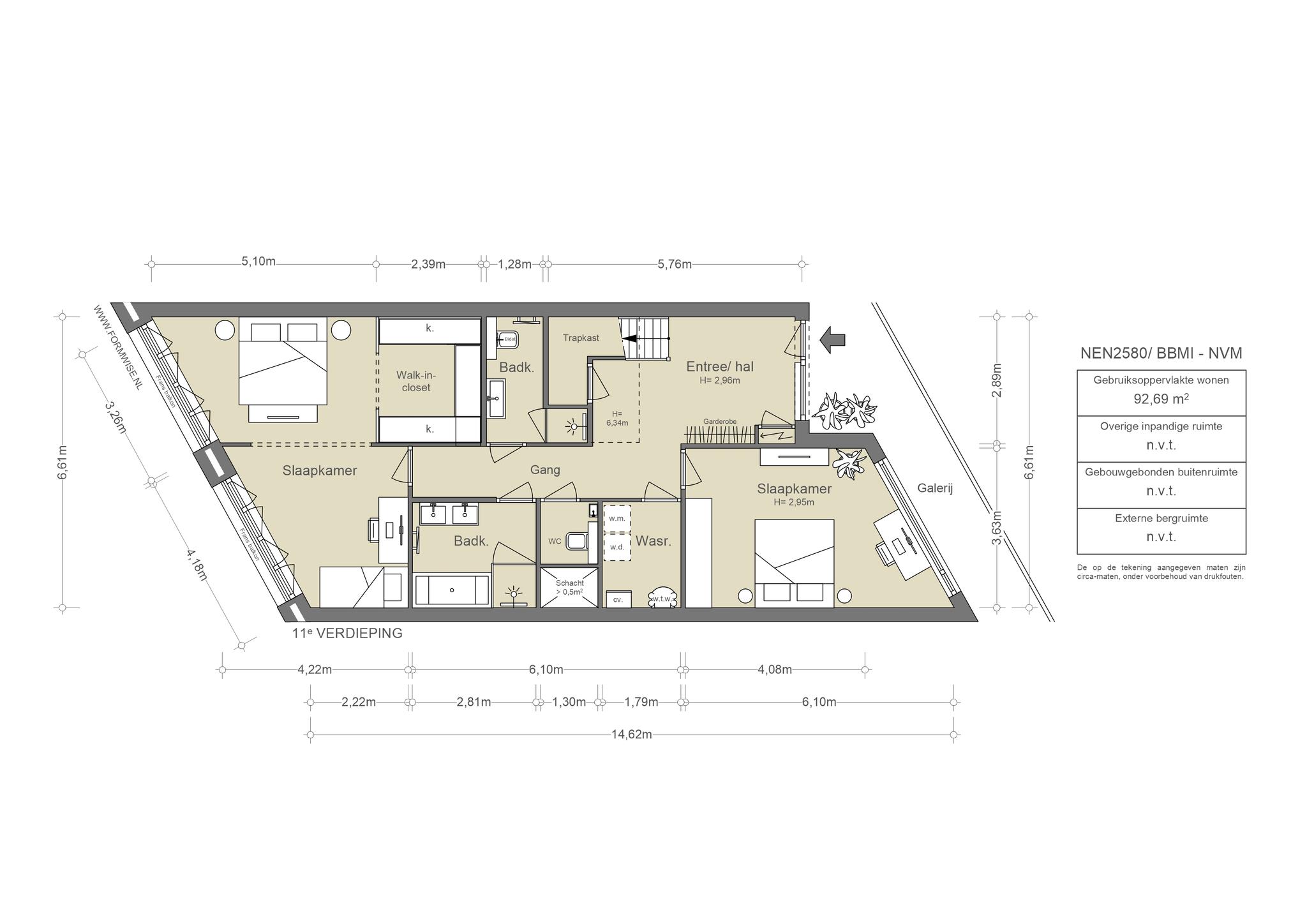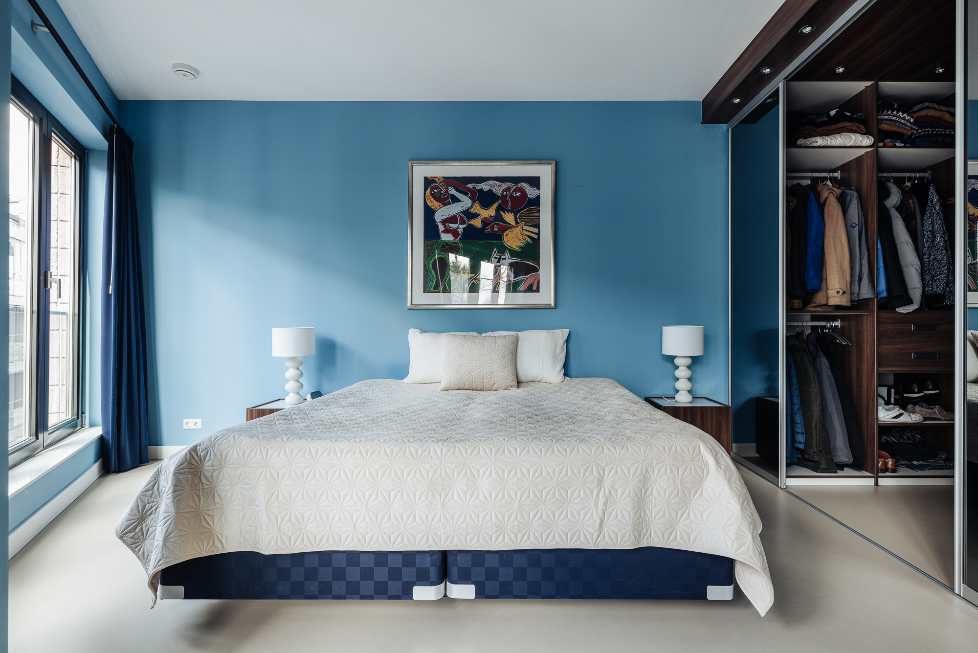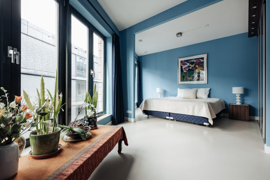 De ingang bevindt zich op een rustige galerij met uitzicht op de siertuin. Dit deel van de galerij wordt uitsluitend gebruikt door de bewoners van het appartement en hun bezoekers. Binnenkomst in een ruime hal met bergruimte en gastentoilet. Logeerkamer annex kantoor aan de galerij zijde. In de hal zijn er twee badkamers. De grote badkamer is voorzien van een ligbad, douche en dubbele wastafel. De gastenbadkamer is voorzien van een douche, wastafel en bidet. De hoofdslaapkamer is aan de zijkant van het gebouw gelegen met twee grote raampartijen met een Frans balkon. Met een schuin oog kun je het water van het Oosterdok zien. Deze ruime kamer biedt voldoende ruimte voor een bed en aanhorige meubels. Tevens is er een inloopkast met ingebouwde kastenwand. Het is mogelijk om van deze grote kamer twee slaapkamers te maken. In de hal is er ook nog een bergruimte met aansluiting voor wasmachine en droger.