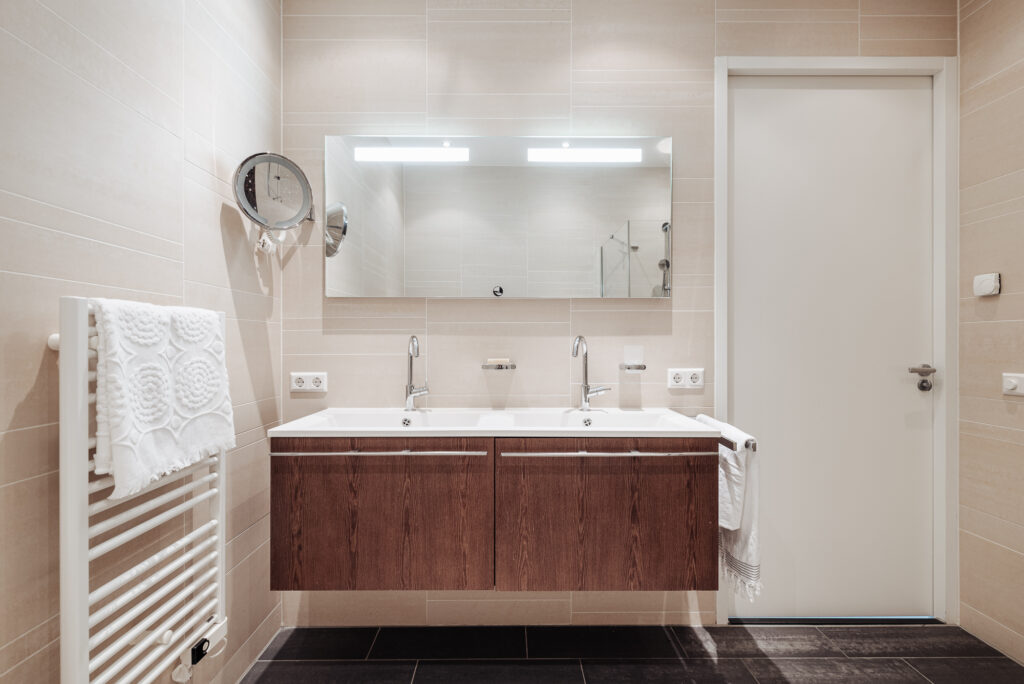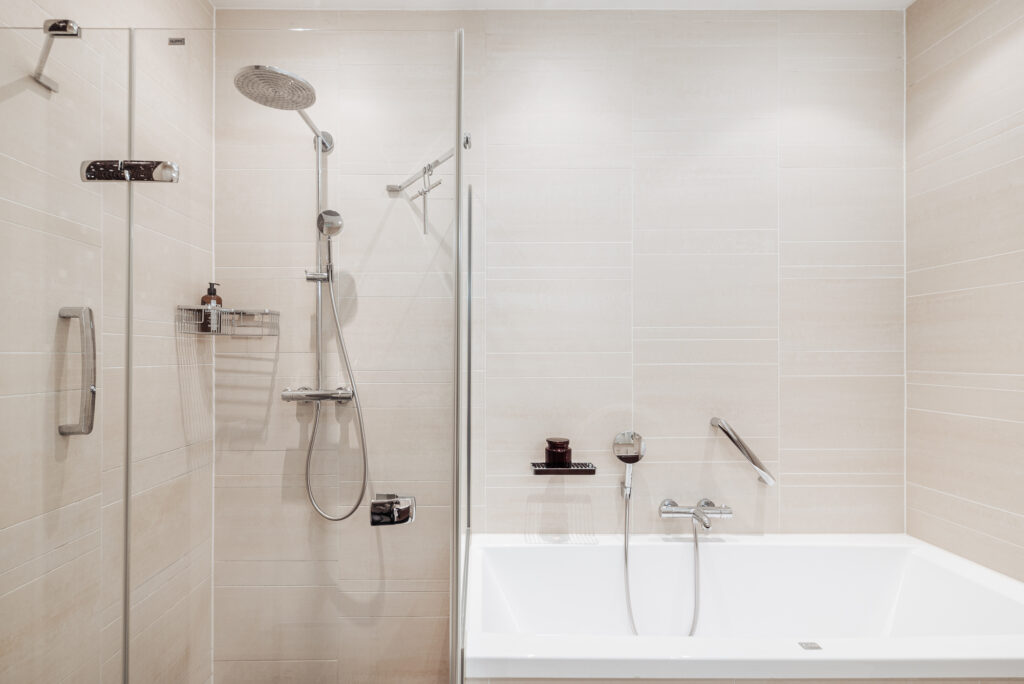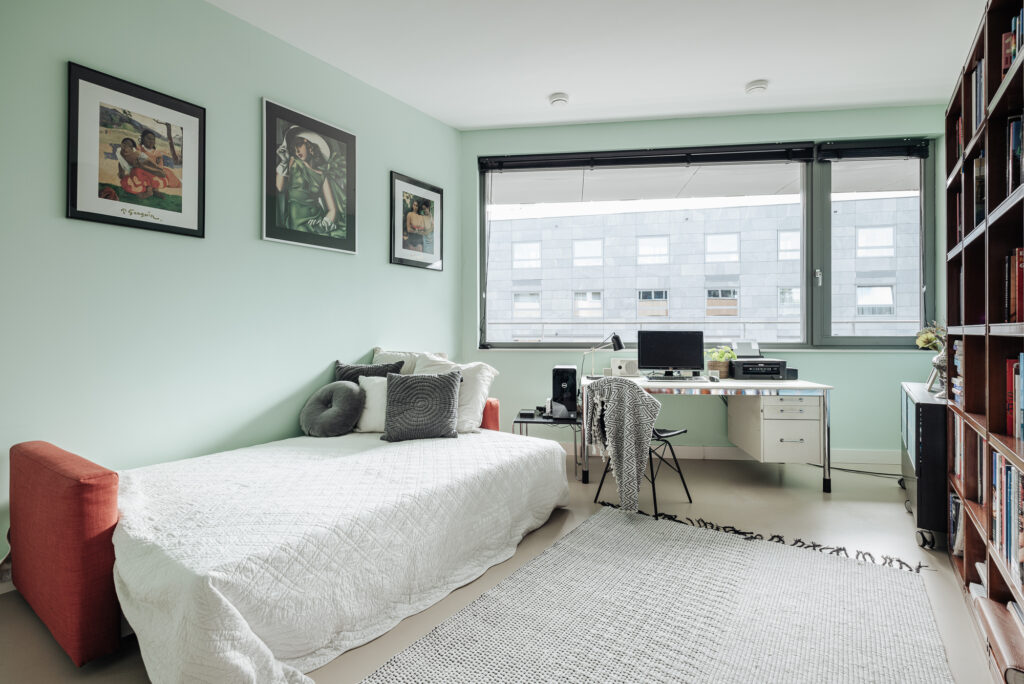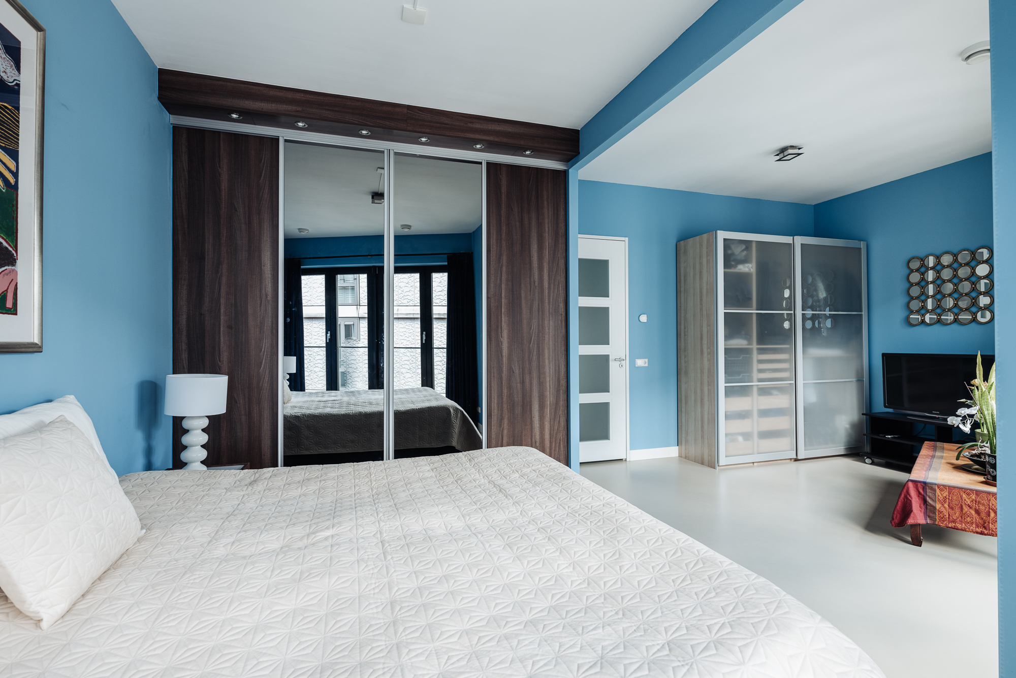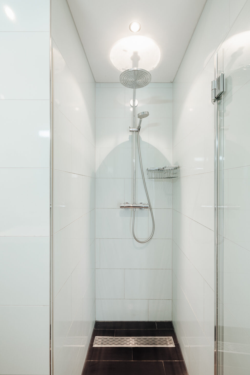 De ingang bevindt zich op een rustige galerij met uitzicht op de siertuin. Dit deel van de galerij wordt uitsluitend gebruikt door de bewoners van het appartement en hun bezoekers. Binnenkomst in een ruime hal met bergruimte en gastentoilet. Logeerkamer annex kantoor aan de galerij zijde. In de hal zijn er twee badkamers. De grote badkamer is voorzien van een ligbad, douche en dubbele wastafel. De gastenbadkamer is voorzien van een douche, wastafel en bidet. De hoofdslaapkamer is aan de zijkant van het gebouw gelegen met twee grote raampartijen met een Frans balkon. Met een schuin oog kun je het water van het Oosterdok zien. Deze ruime kamer biedt voldoende ruimte voor een bed en aanhorige meubels. Tevens is er een inloopkast met ingebouwde kastenwand. Het is mogelijk om van deze grote kamer twee slaapkamers te maken. In de hal is er ook nog een bergruimte met aansluiting voor wasmachine en droger.
