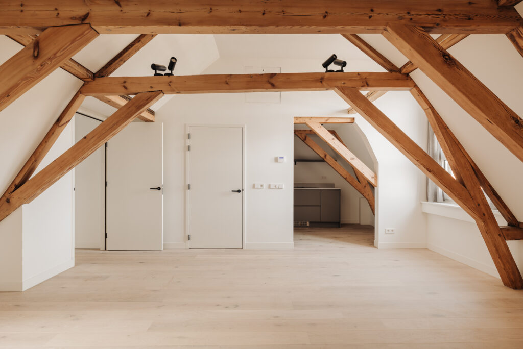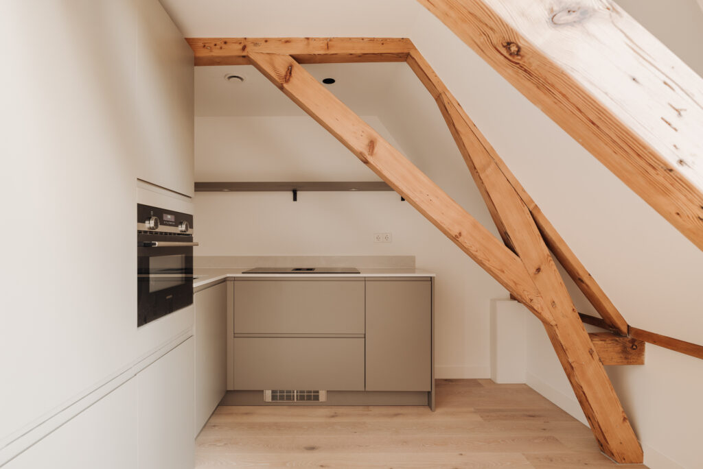 Bij binnenkomst middels spreekt de moderne open woonkeuken direct tot de verbeelding. De maatwerk keuken is voorzien van diverse inbouwapparatuur. Door de prachtige originele balkenconstructie ontstaat er een ruimtelijk en open gevoel. Er zijn twee slaapkamers en een badkamer met wastafel en douche. Op de hal bevindt zich een separaat toilet. Het gehele appartement is voorzien van vloerverwarming en er is een lichtplan aanwezig. Er zijn lichte materialen en kleuren gebruikt wat een gevoel van elegantie en luxe geeft.