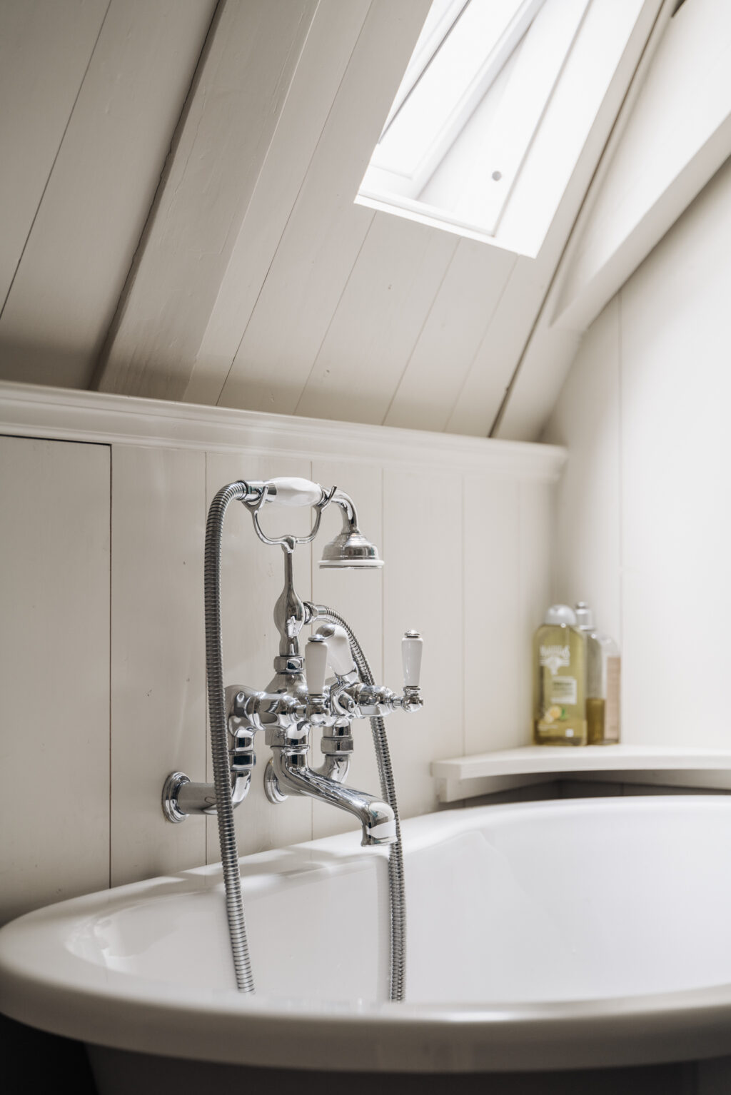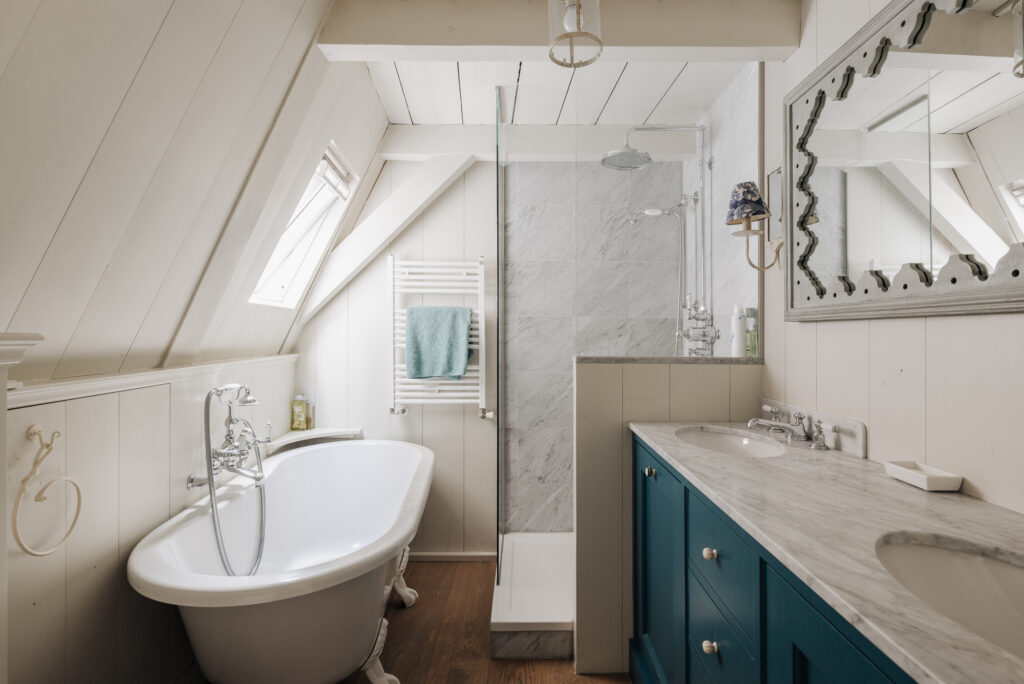 Romantische badkamer met marmeren wastafelmeubel, douche, toilet en een sierlijk bad op pootjes. Slaapkamer met op maat gemaakte garderobekasten en een aparte ladekast.