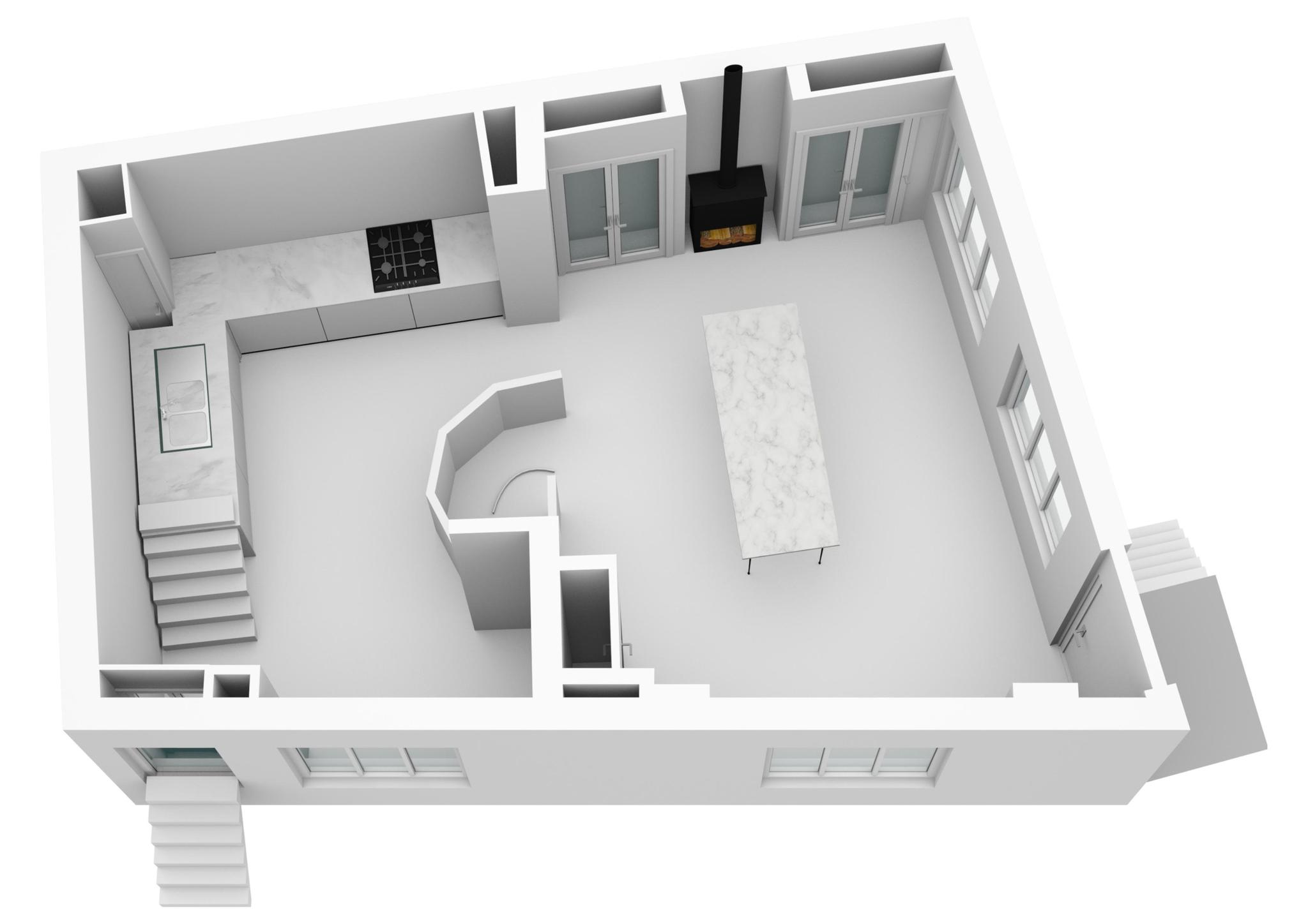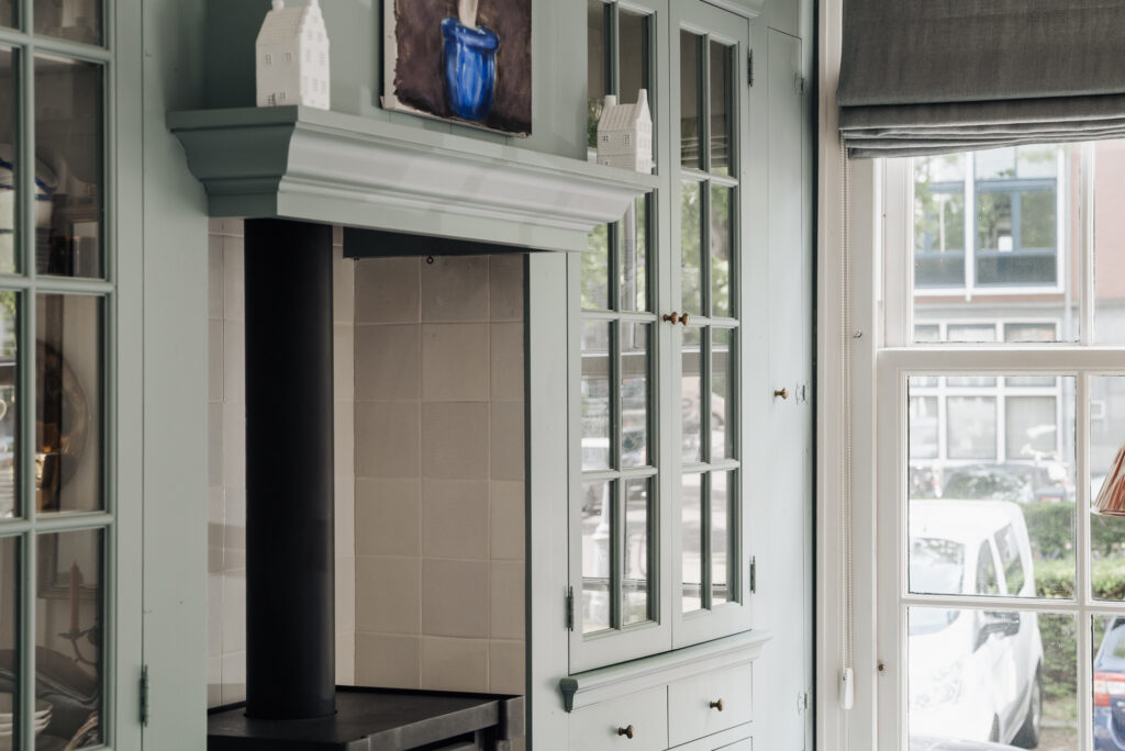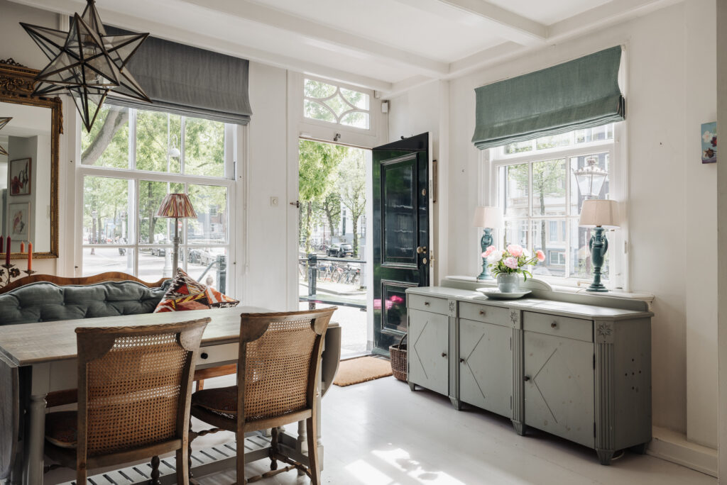 Gezellige ruime woonkeuken met een heerlijke houtkachel en veel licht. Door de verhoogde ligging is er veel privacy en vrij zicht op de Reguliersgracht en de Falckstraat. Veel aandacht is er besteed aan de keuken, deze is voorzien van een elektrische AGA fornuis met twee elektrische ovens, een marmeren blad en veel inbouwapparatuur. De bordestrap is een favoriete zit en is een verlengstuk van de keuken. Met de hele dag zon en aanspraak van buurtgenoten een heerlijke plek.