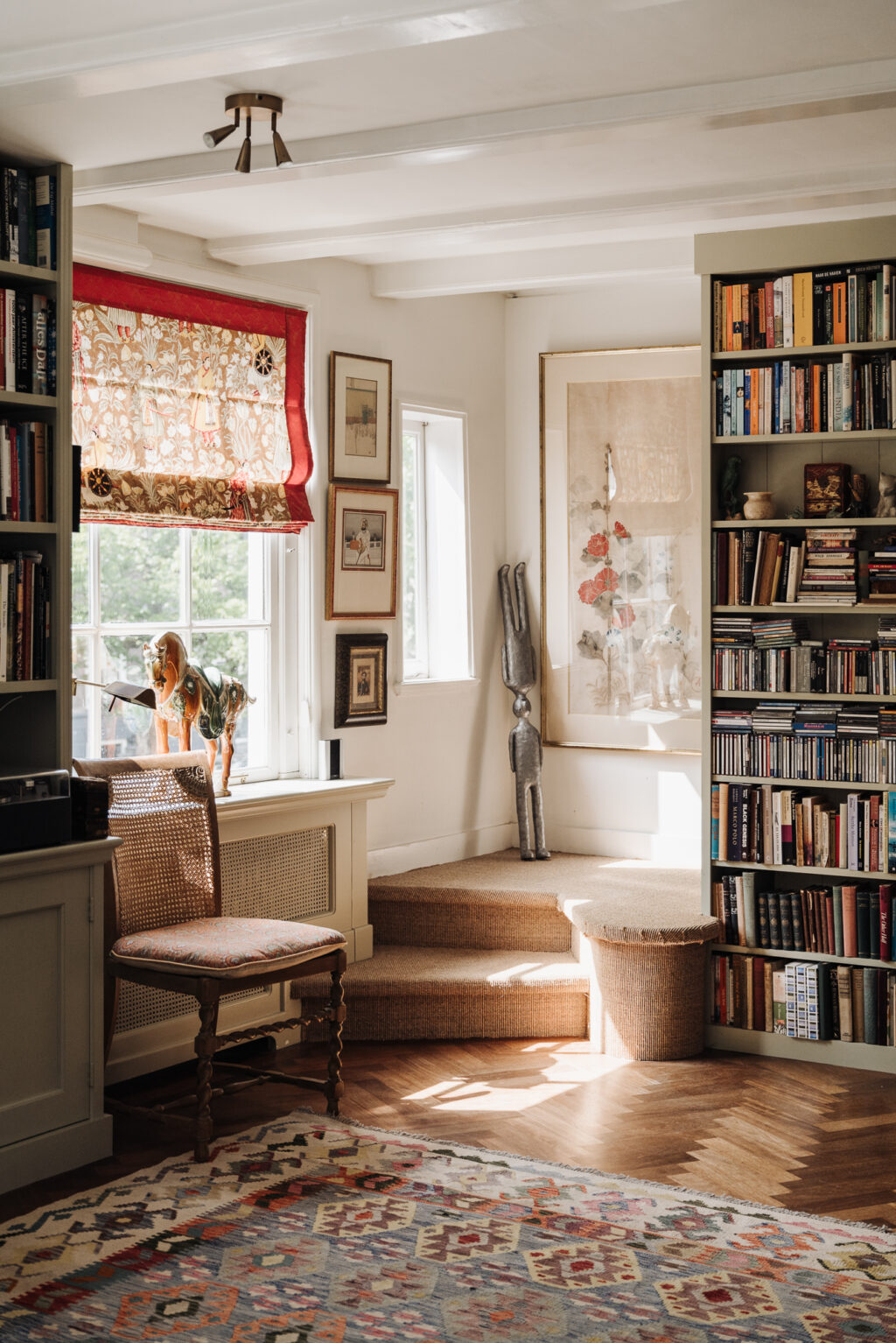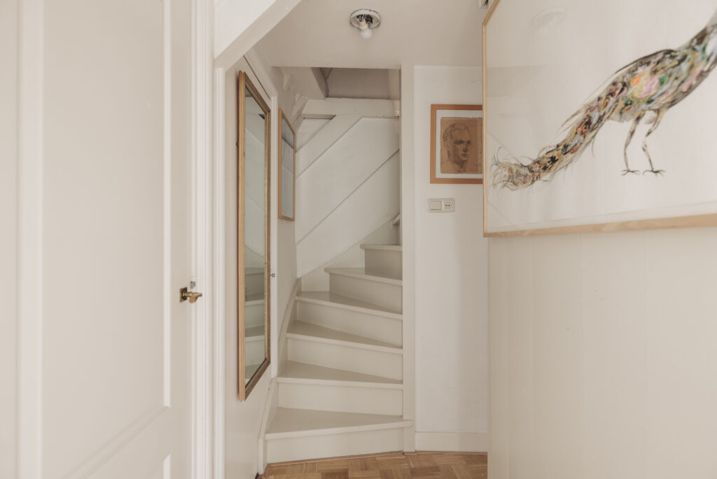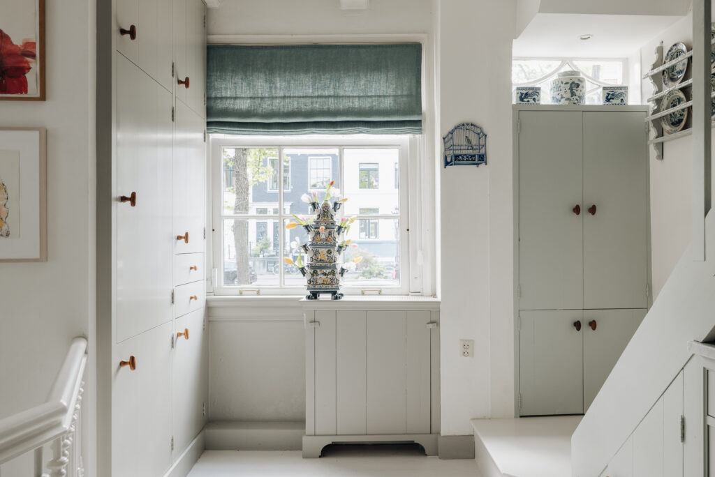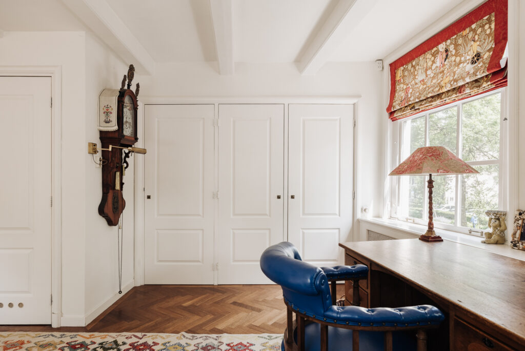 Riante lichte ruimte waar met een visgraat parketvloer en in de toiletruimte is een fonteintje en plaats voor een wasmachine/droger. Ook deze verdieping is goed gedetailleerd en met precisie ingebouwd met ombouwkasten voor radiators, een bibliotheekkast met dichte onderkasten wandkasten en charmante zijkastjes.