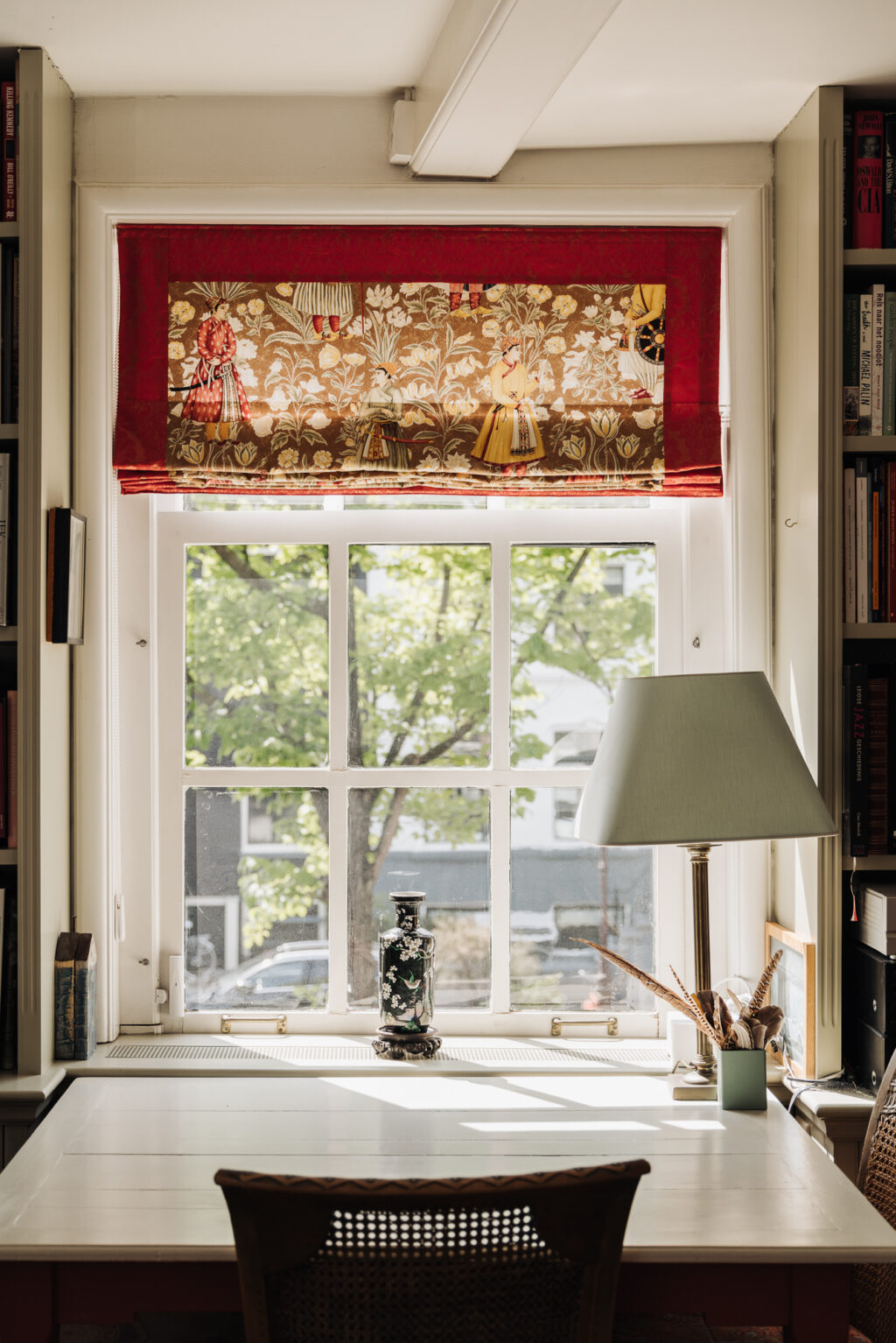 Een verdieping waar rust en sereniteit heerst, de houtkachel en het balkenplafond maken het een knus geheel. Hier is het uitzicht prachtig, men waant zich in de natuur, kijkend op de monumentale honingbomen op het plein, en komt de hoekligging volledig tot zijn recht door de lichtinval. De oude waskom is een charmant detail.