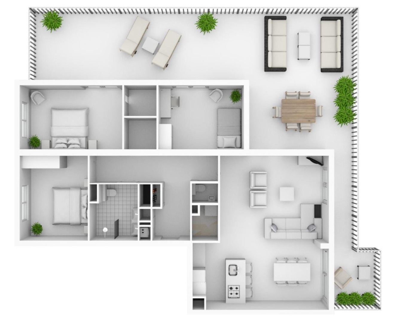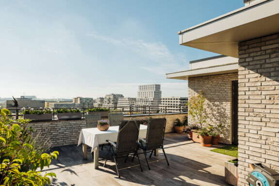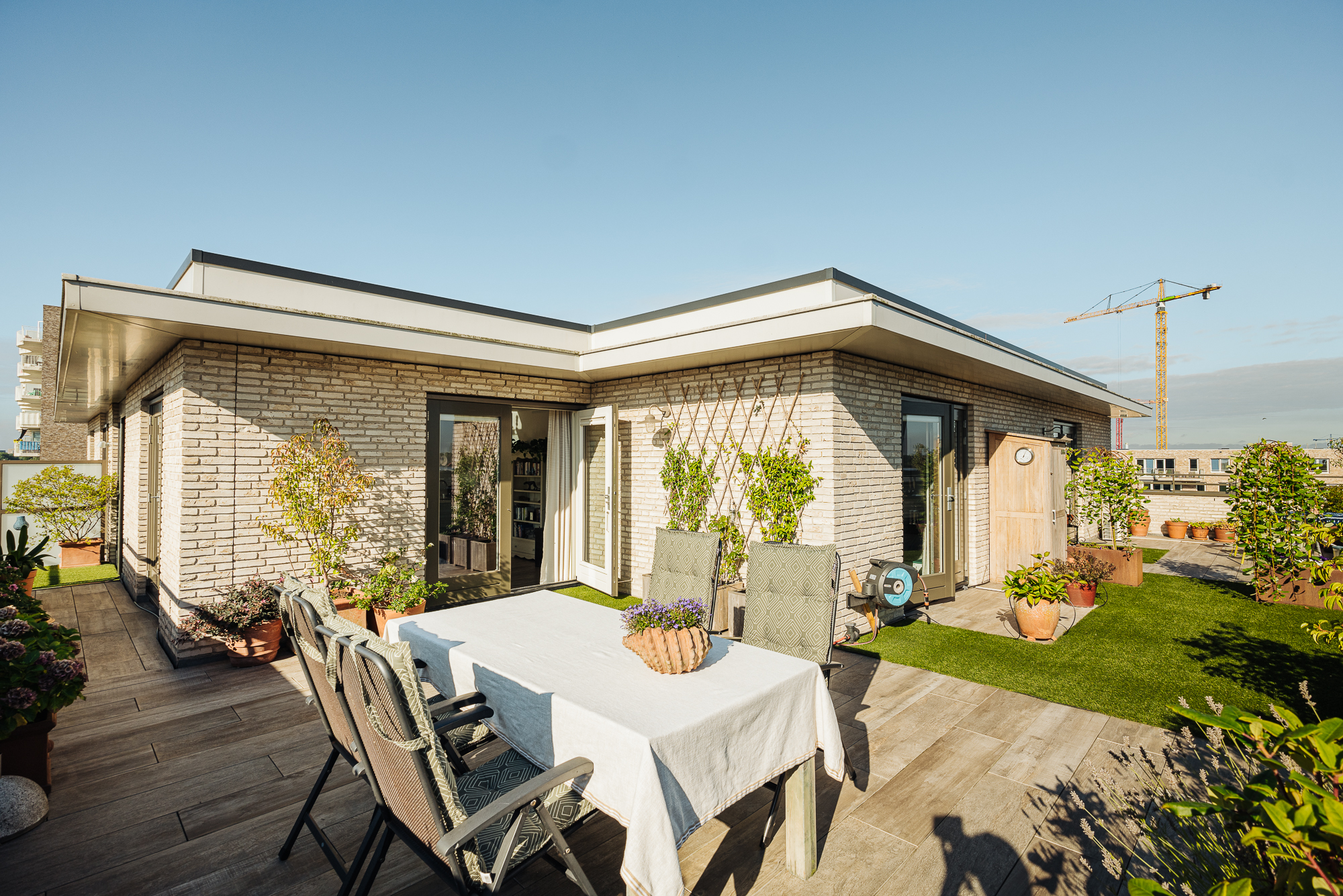 Het dakterras heeft ruimte voor diverse zitjes en is bereikbaar vanuit de living en vanuit 2 slaapkamers.