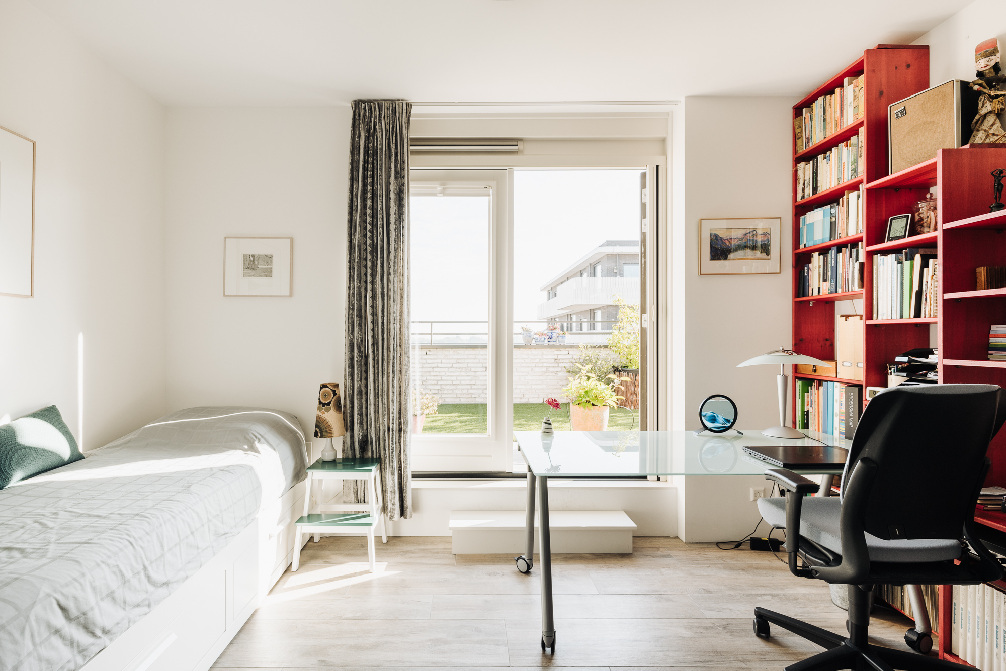 Het huis zelf is heel licht, door de grote ramen aan alle kanten. Dit penthouse is een half vrijstaand huis op zes hoog, zonder bovenburen. Het is uitermate comfortabel wonen: alles gelijkvloers, met een lift, goed schoon gehouden gangen en hal, het gemak van vijf eigen fietsplekken in de overdekte fietsenstalling en een parkeerplaats in de nabij gelegen garage.