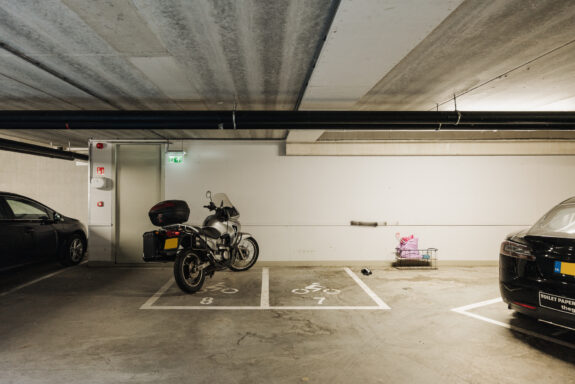 Het appartement beschikt over één parkeerplaats en een motorplaats in het naastgelegen gebouw. De prijs voor deze parkeerplaats is € 50.000,- k.k.
