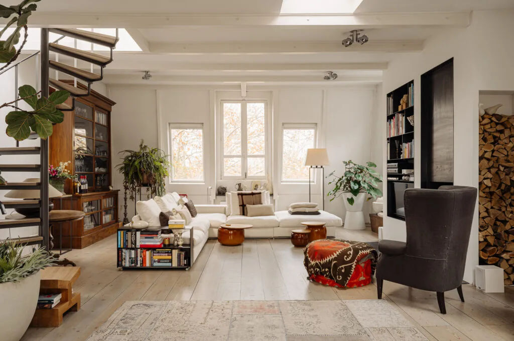 On the dining side, there is ample space for a large dining table. Thanks to the natural light and views of the inner gardens, this area feels spacious and serene. The sitting area at the front is comfortably arranged around an open fireplace, offering more than enough space for a large sofa and additional armchairs. The wooden floor, the colour palette and the ceiling with exposed beams together create a warm and tranquil atmosphere.