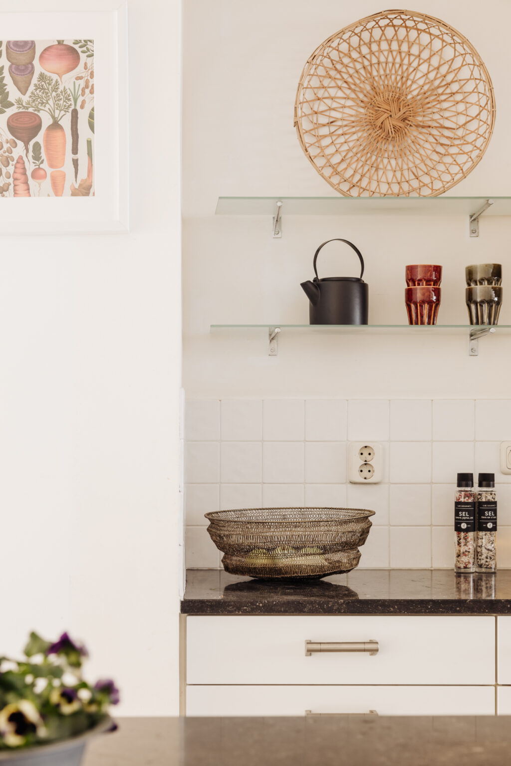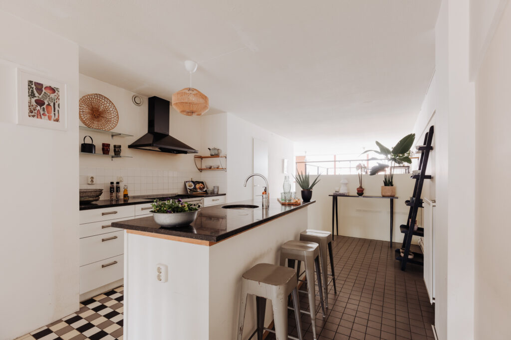 De open woonkeuken in het midden van het appartement ligt ca. 1,50 m. hoger dan de voor- en achterkamer. Het keukeneiland is de centrale plek in huis om elkaar te ontmoeten voor een kop koffie, een glas wijn en een hapje.