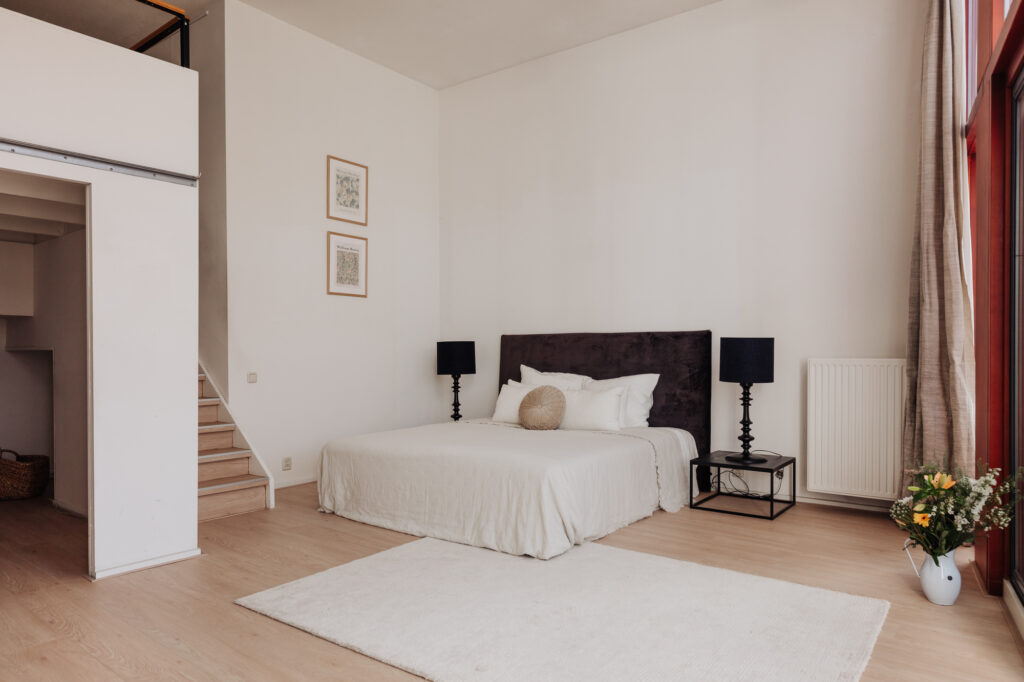 De riante slaapkamer is aan de achterzijde gelegen en heeft een schuifpui naar de loggia, die door de hoekligging van het appartement licht en zonnig is. Vanaf het middaguur tot in de avond kun je van de zon genieten op de loggia. Door de hoge glazen schuifdeuren open te doen, betrek je de buitenruimte bij de royale slaap- en leefruimte. Door de hoekligging is dit appartement ruim een meter breder dan de andere appartementen.