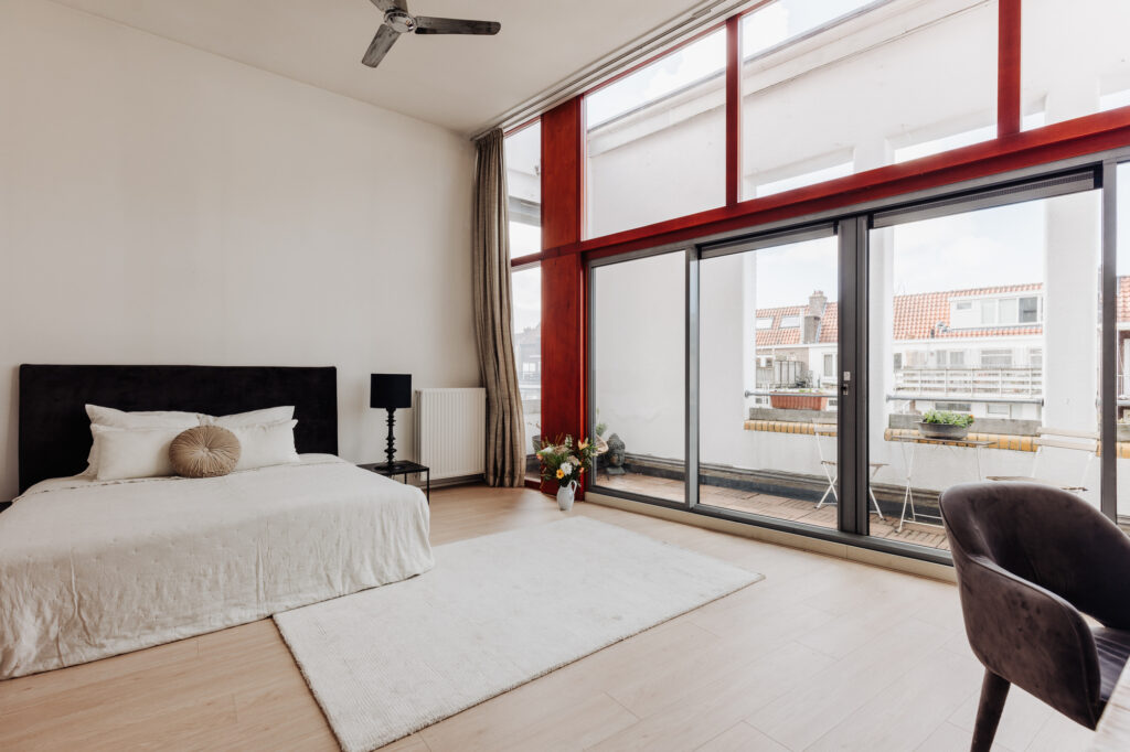 Vanuit de slaapkamer is de walk-in closet en een extra berging toegankelijk. Zowel de slaapkamer als de walk-in closet zijn voorzien van een nieuwe, licht eiken laminaatvloer. De slaapkamer is 6,20 m breed en heeft een hoogte van ruim 3,75m, waardoor er ruimte is voor grote kunstwerken, spiegels of schermen aan de muur. Aan de achterzijde is recent een geheel vernieuwde pui geplaatst, met grote glazen schuifdeuren, van dubbel glas.