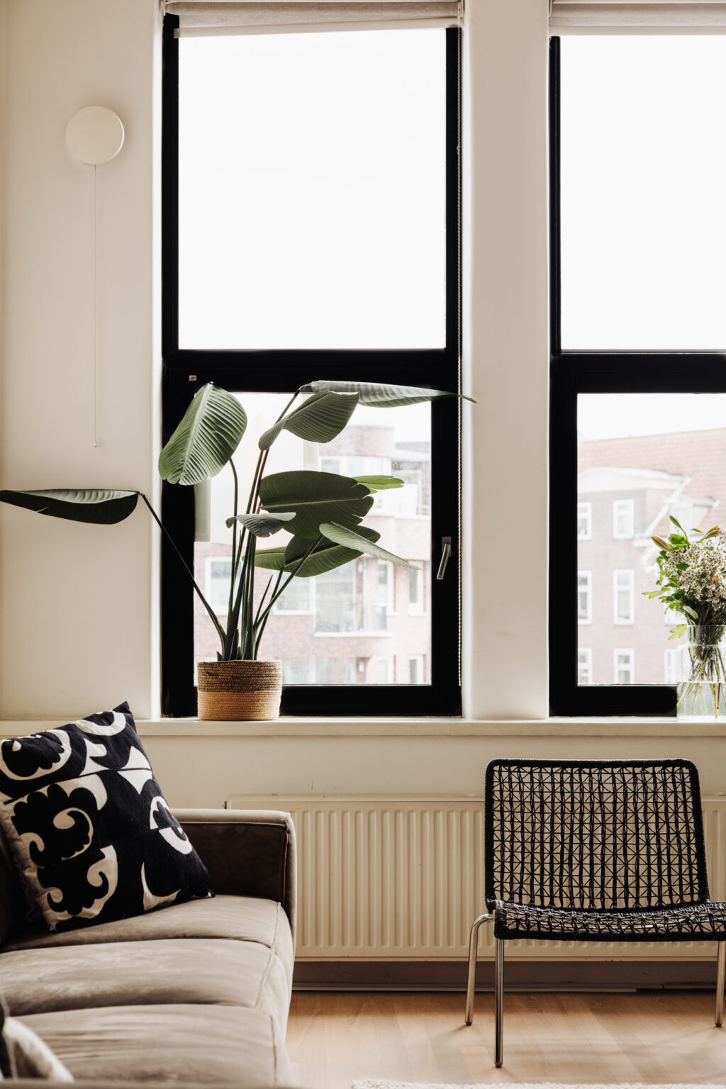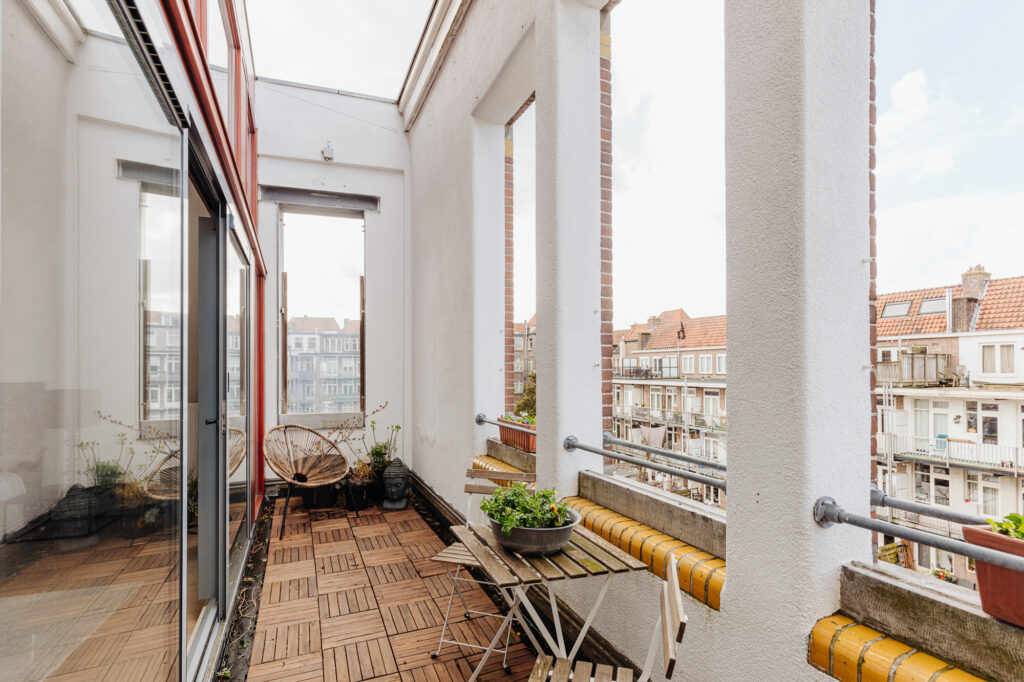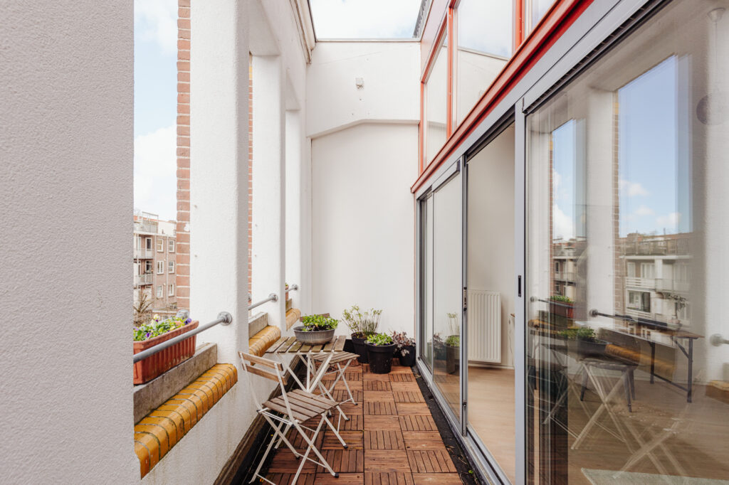 De achterpui is recent geheel vernieuwd en geïsoleerd door de VvE en voorzien van dubbel glas. Door de grote schuifdeuren open te zetten, verbind je de binnenruimte met de loggia buiten en haal je de zon naar binnen.