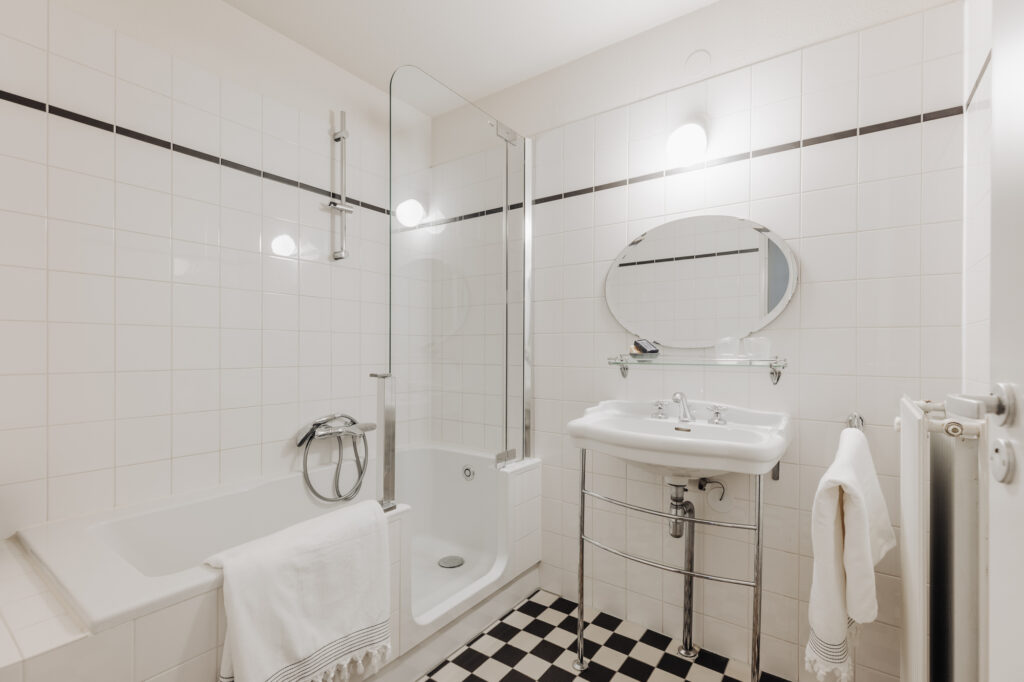 Op hetzelfde vloerniveau als de keuken, liggen de badkamer, separaat toilet en de berging (was- droogcombinatie en voorraadruimte). De badkamer is voorzien van een ingenieuze ligbad- douchecombinatie en een wastafel.