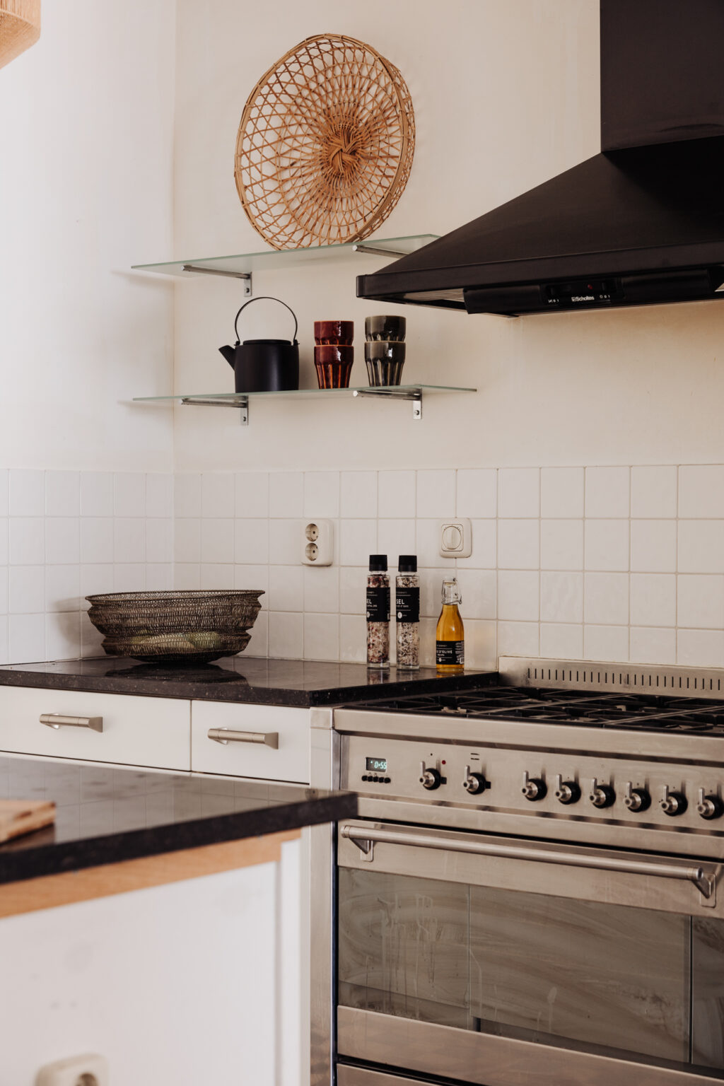 De open woonkeuken in het midden van het appartement ligt ca. 1,50 m. hoger dan de voor- en achterkamer. De keuken met een keukeneiland is voorzien van Belgisch hardstenen aanrechtbladen en een breed Smeg fornuis met afzuigkap. Het keukeneiland is de centrale plek in huis om elkaar te ontmoeten voor een kop koffie, een glas wijn en een hapje.