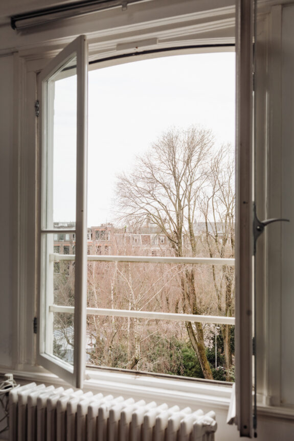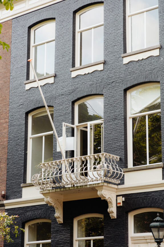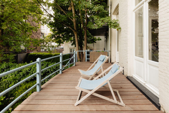 The balcony on the raised ground-floor level is approximately 18.2 sqm and has new decking and a light-blue steel railing. The terrace offers a beautiful view of leafy Vondelpark. The roof deck on top of the third floor is approximately 23 sqm.
