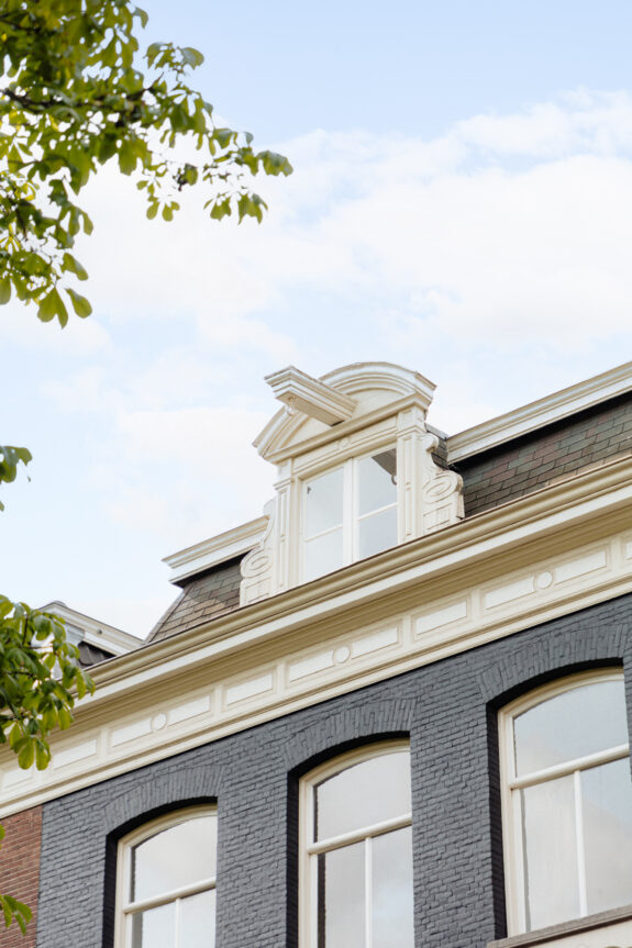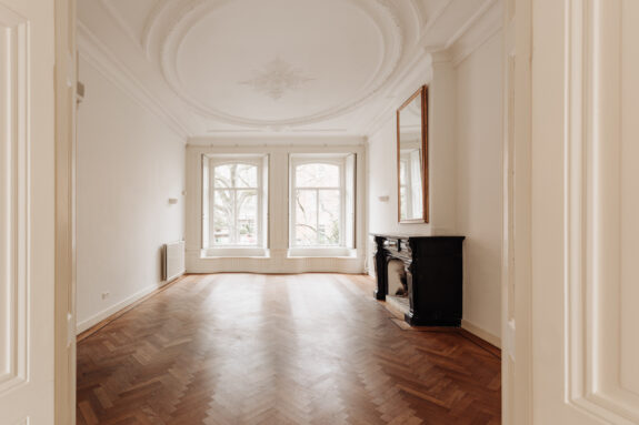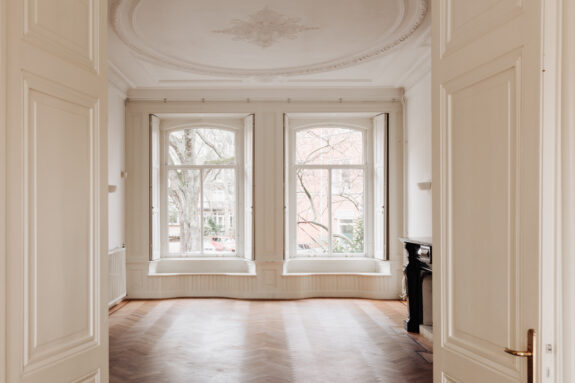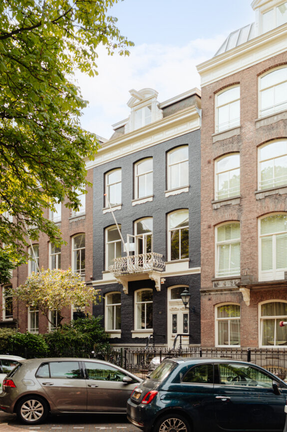 The townhouse was built in 1879 according to the designs of architects I.J. Breslou and K. Ooms. Characteristic of the exterior is the molded facade with ornate details, the classic balcony with swirled elements on the railings on the first floor and the steps to the front door. At the front, the building is three windows wide with and total of nine windows and at the rear there are no less than fourteen windows. Spanning a width of over 7.25 meters and a length of over 14.5 meters, all floors are generous in their dimensions. Furthermore, the property has soaring ceilings: 3.60 meters tall on all floors.
