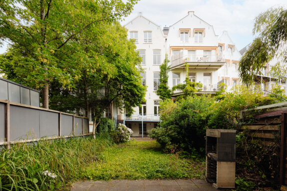 Een absolute verrassing van het gebouw is de achtertuin. Deze is riant. Daarbij is de tuin omgeven door groen en heeft een heerlijke ligging op het zuidwesten. Ze is toegankelijk vanuit het souterrain en met een trap vanaf de veranda van de beletage. De tuin is circa 205 m² en voorzien van een terras, beplanting en schuttingen.