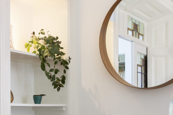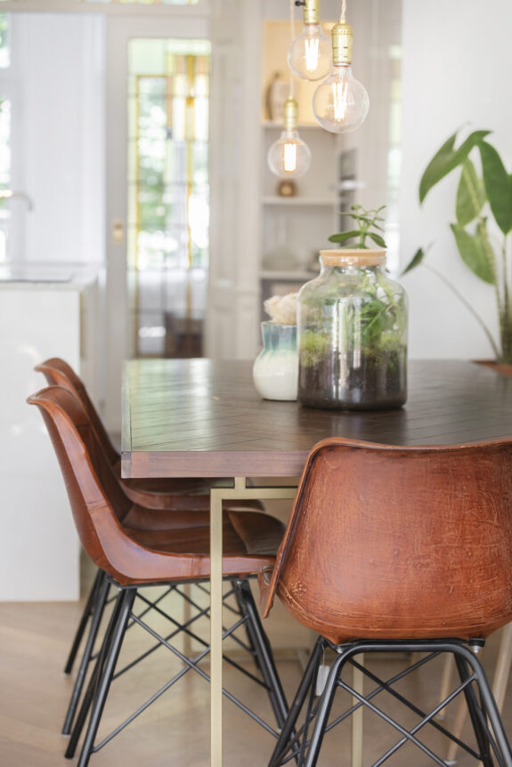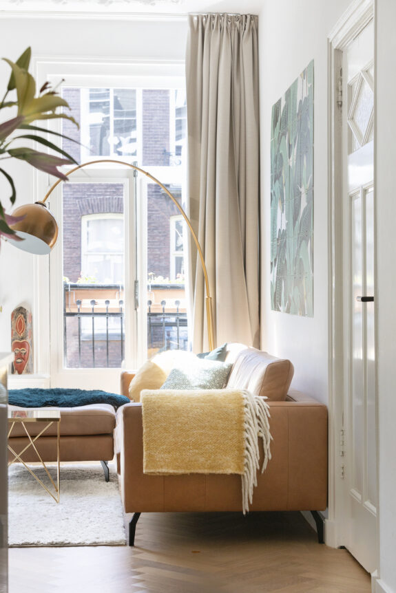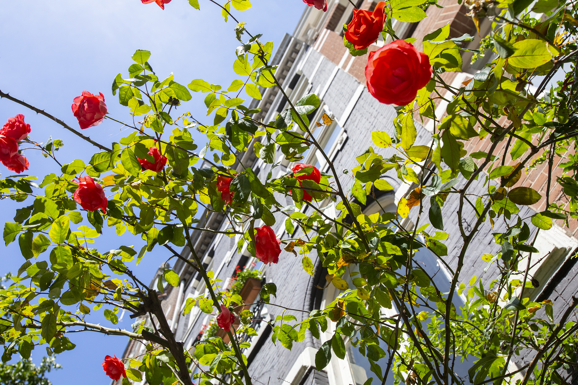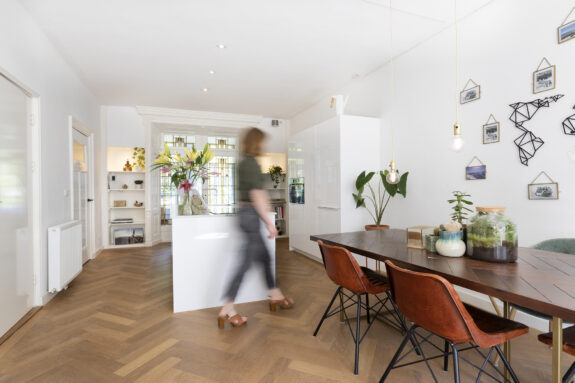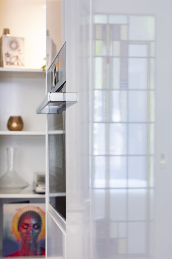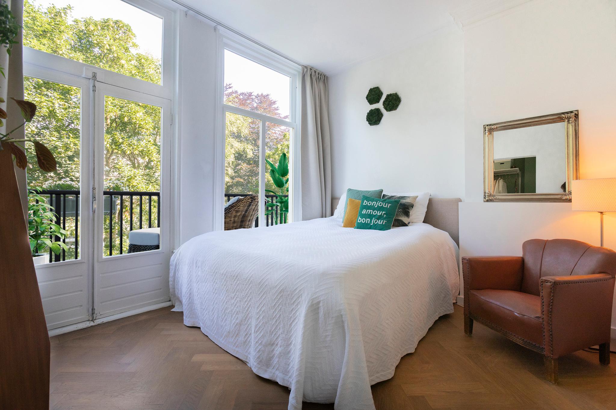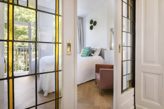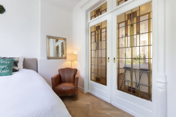 Achter de keuken bevindt zich de originele houten en-suite kast met glas-in-lood deuren. Hierdoor is het licht van voor tot achter in de woning ononderbroken, terwijl er een duidelijke scheiding tussen het leef- en slaapgedeelte is gecreëerd. Een pronkstuk. Het slaapgedeelte heeft openslaande deuren naar nu een Frans en binnenkort een volwaardig balkon. Het is bijzonder hoeveel ruimte, rust en groen de binnentuin biedt. Vanuit de slaapkamer kom je in de ruime inloopkast, welke ook als extra werk- of slaapkamer zou kunnen fungeren.