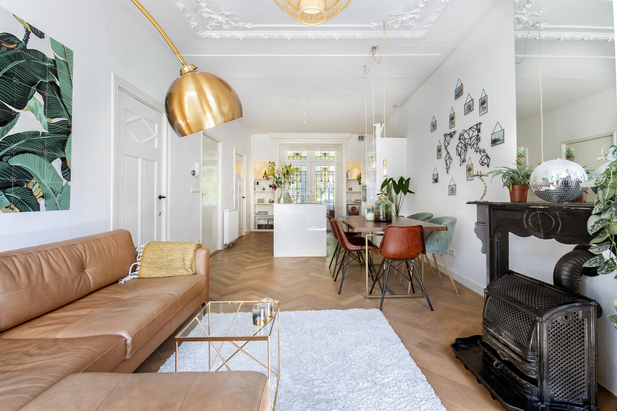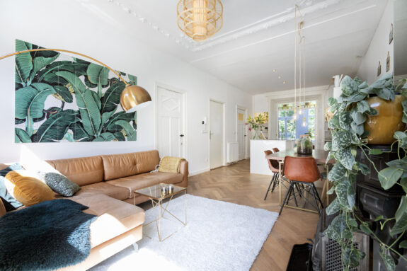 Bij binnenkomst wordt je aandacht direct gegrepen door het ruime woongedeelte, met de openslaande deuren naar het Franse bloemen balkon. Het hoge plafond met ornamenten en de prachtige werkende houtkachel in een zwarte schouw, allen origineel uit 1888, maken het een geliefde ruimte om te verblijven.