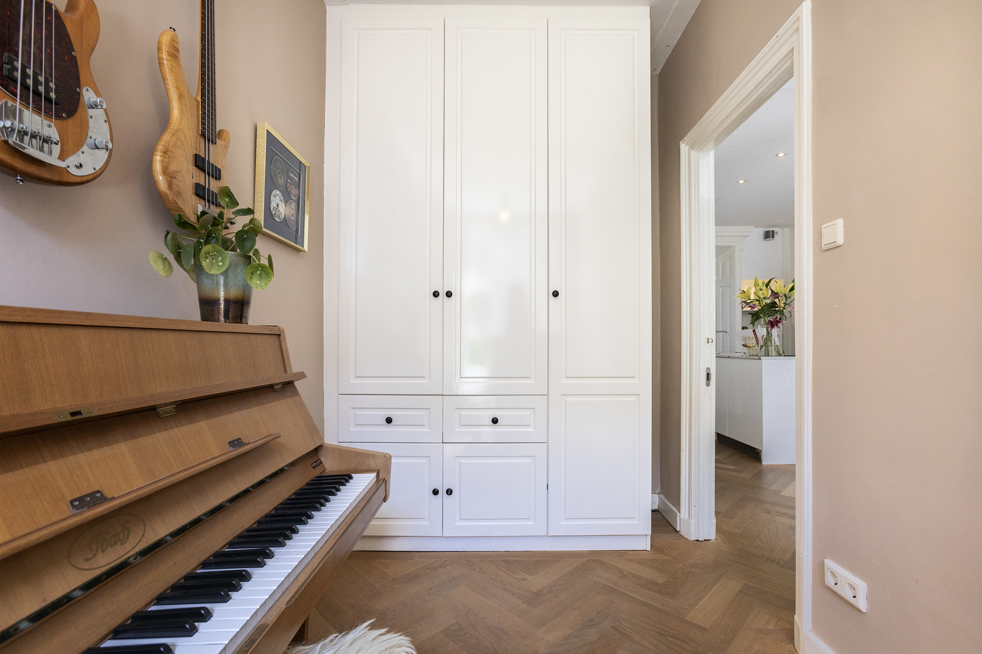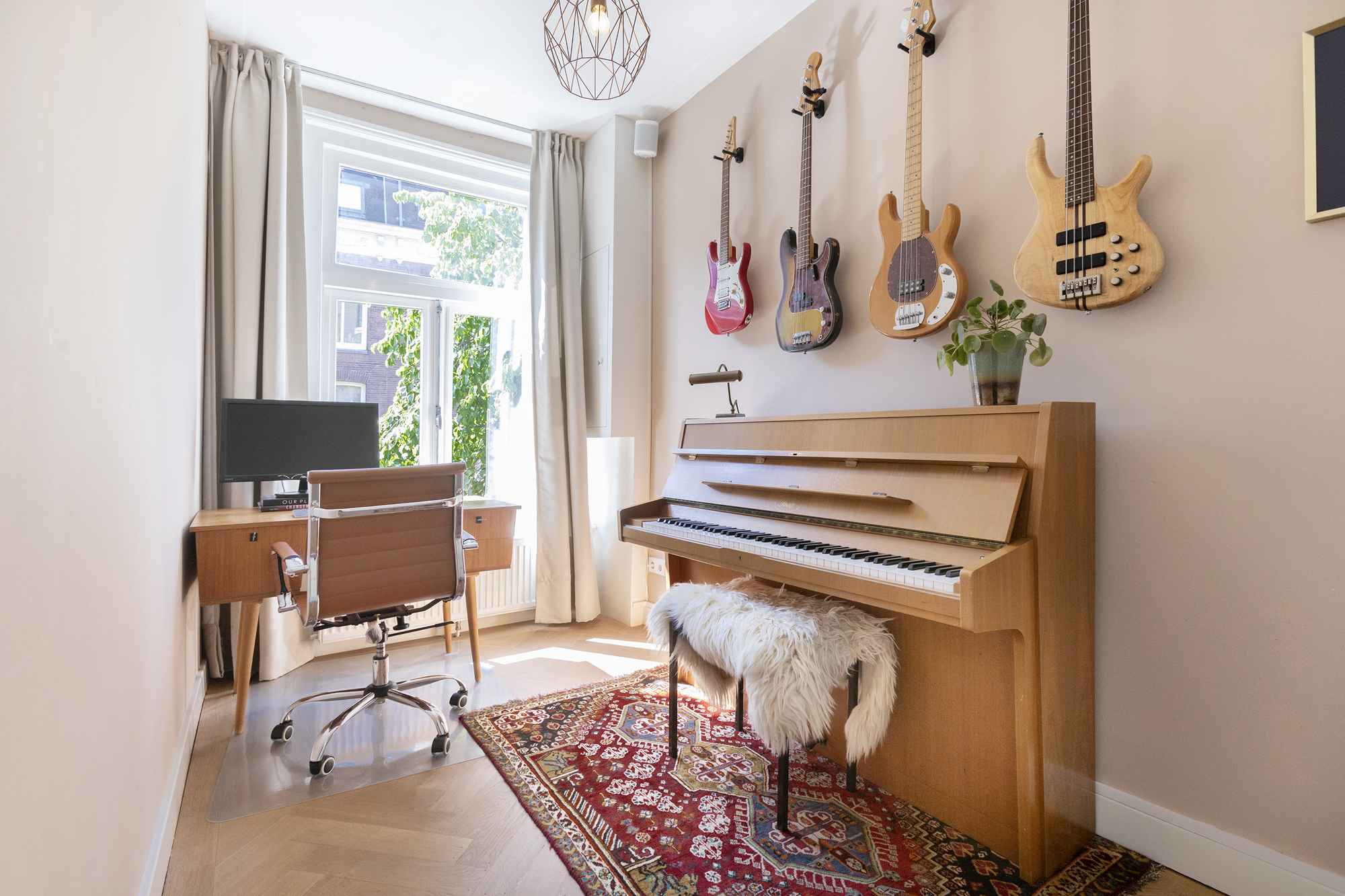 Naast de woonkamer bevindt zich de voormalige slaapkamer met een grote ingebouwde kast. De ruimte fungeert nu als werk- en muziekkamer, en is een plezierige ruimte onder andere door uitzicht op het groen.