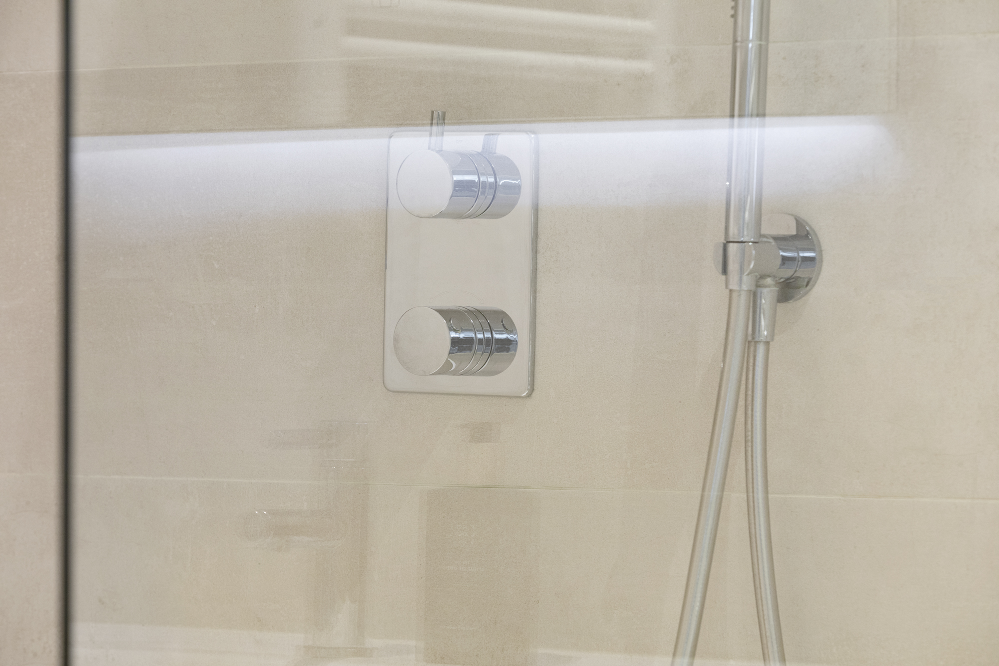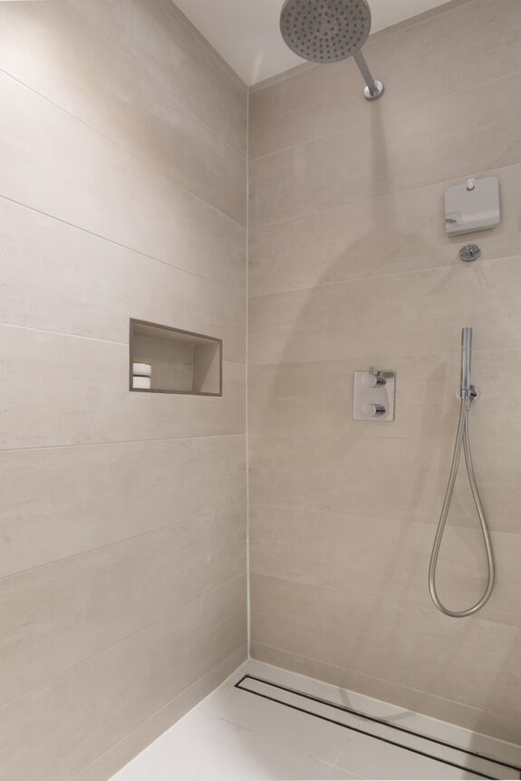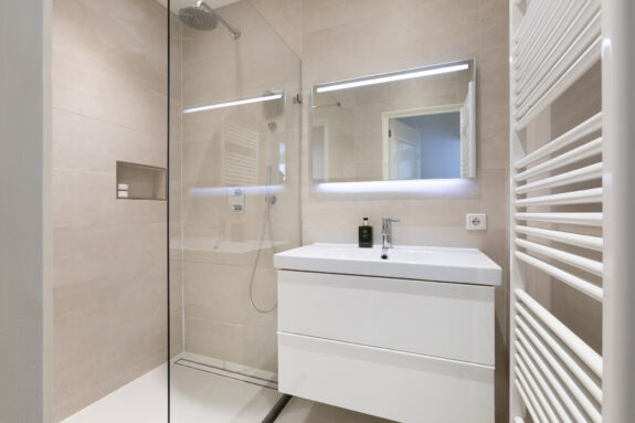 De badkamer is uitgevoerd in natuurtinten. Er is een inloopdouche met een regendouche en een wastafelmeubel met verlichte en verwarmde spiegel. Er is een separaat vrij hangend toilet aanwezig. De badkamer en het toilet zijn gescheiden van het leefgedeelte door middel van een fijn halletje. Door het gehele appartement is een echte eiken houten visgraat vloer gelegd en alle vijf de ruimtes zijn voorzien van een Sonos-muzieksysteem.