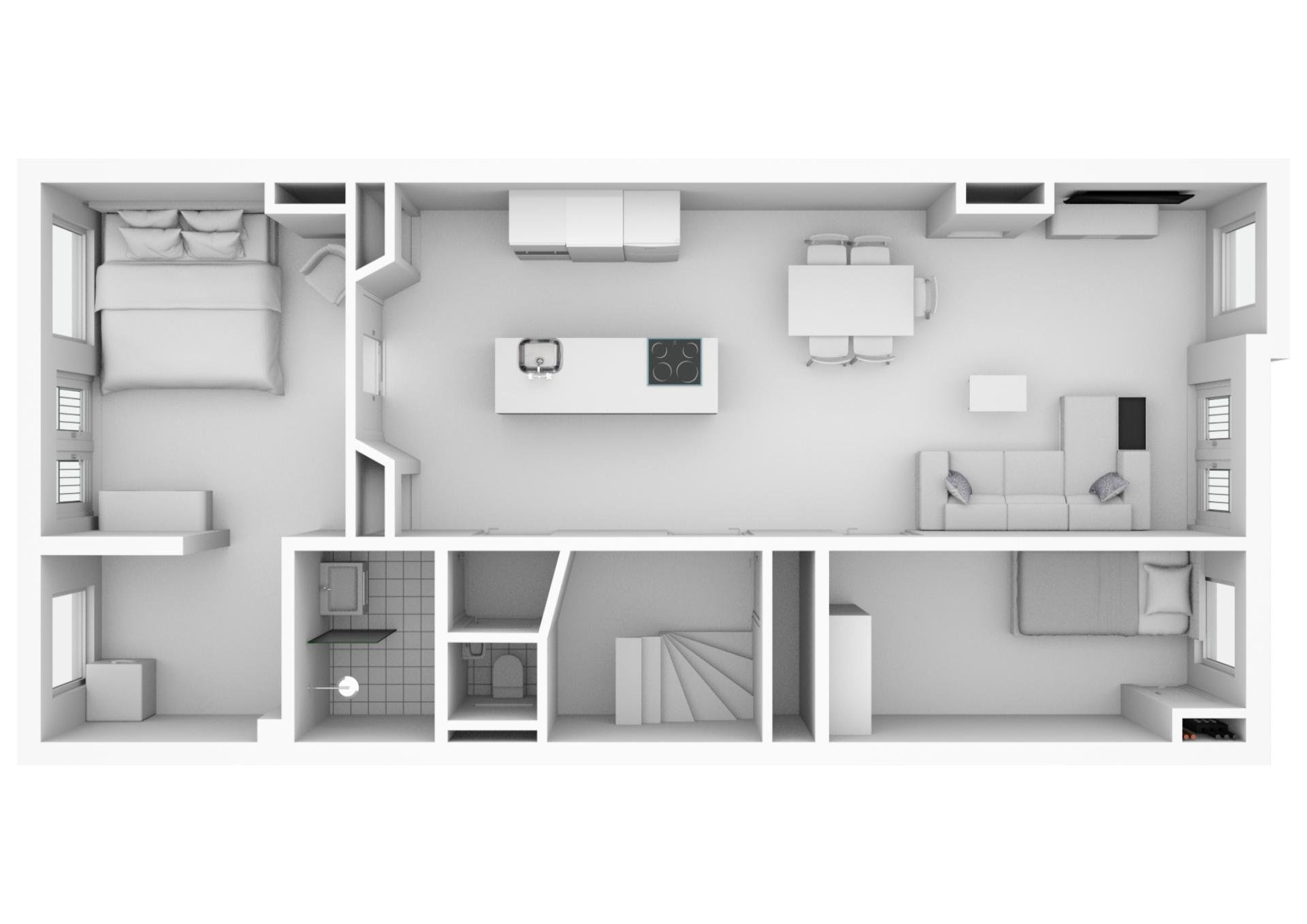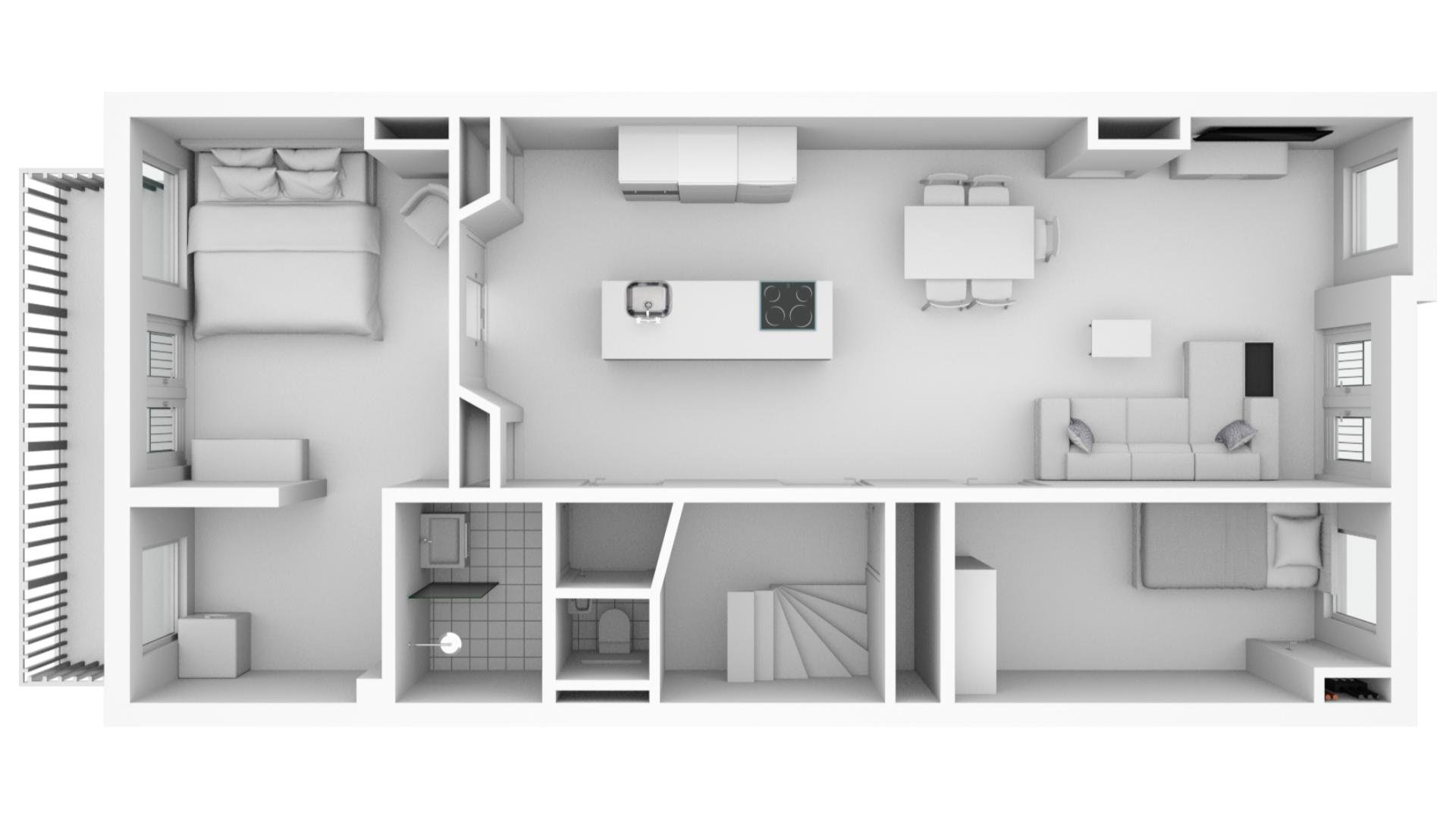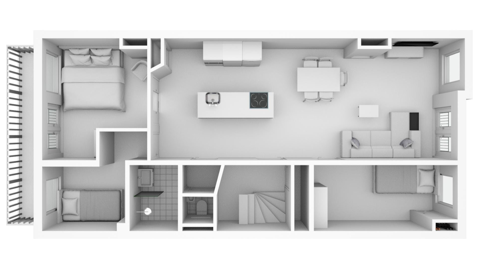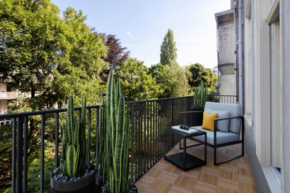 Zowel voor als achter is er momenteel een Frans balkon. Aan de achterkant komt een ruim hang balkon van 6m² waar je kan genieten van de avondzon. De huidige bewoners openen vaak de deuren aan beiden kanten, en brengen zo de groene omgeving naar binnen.