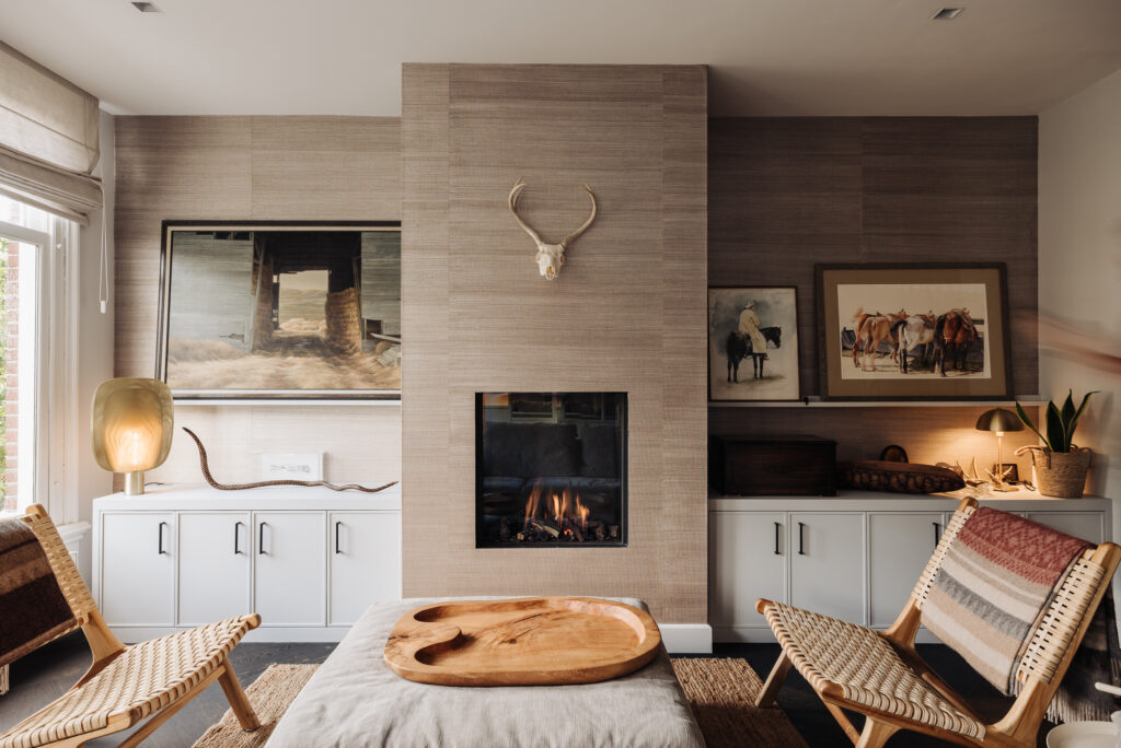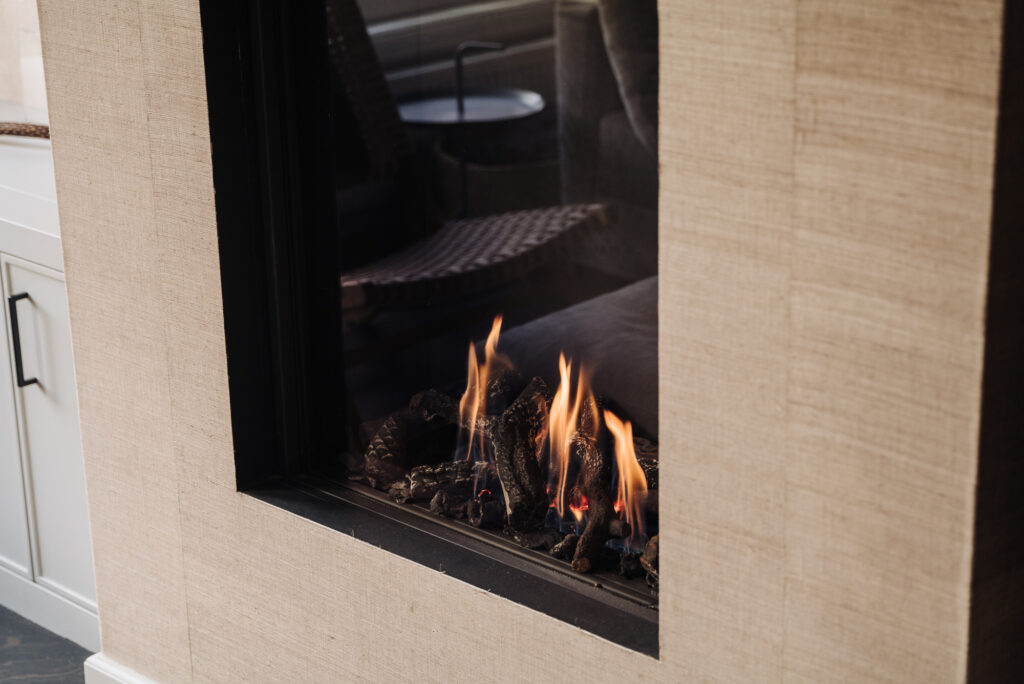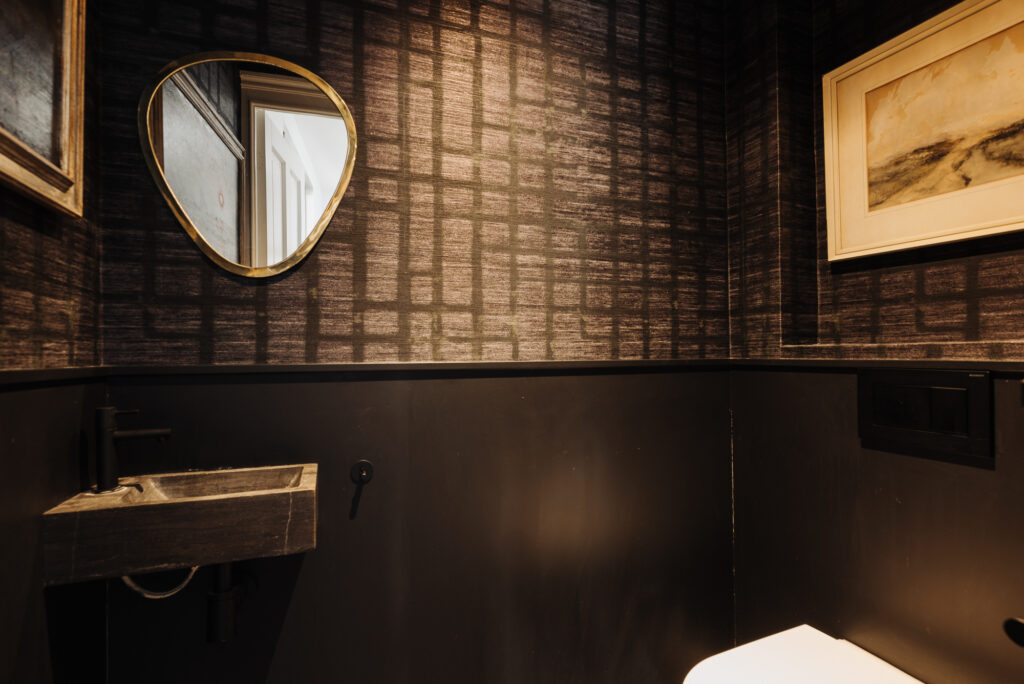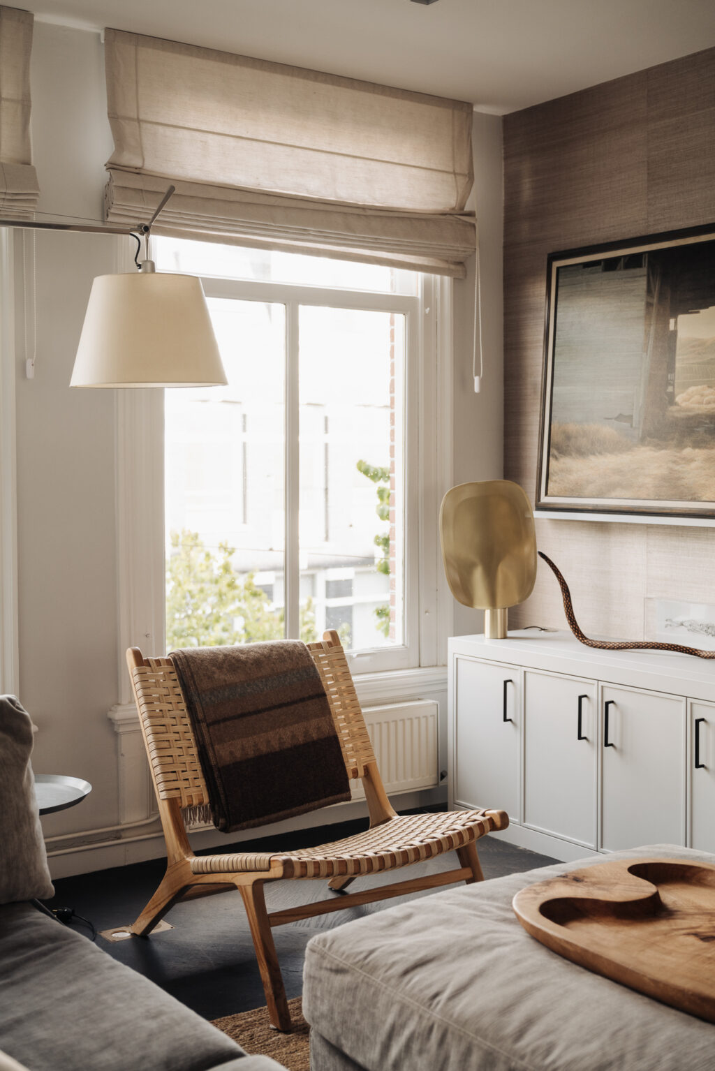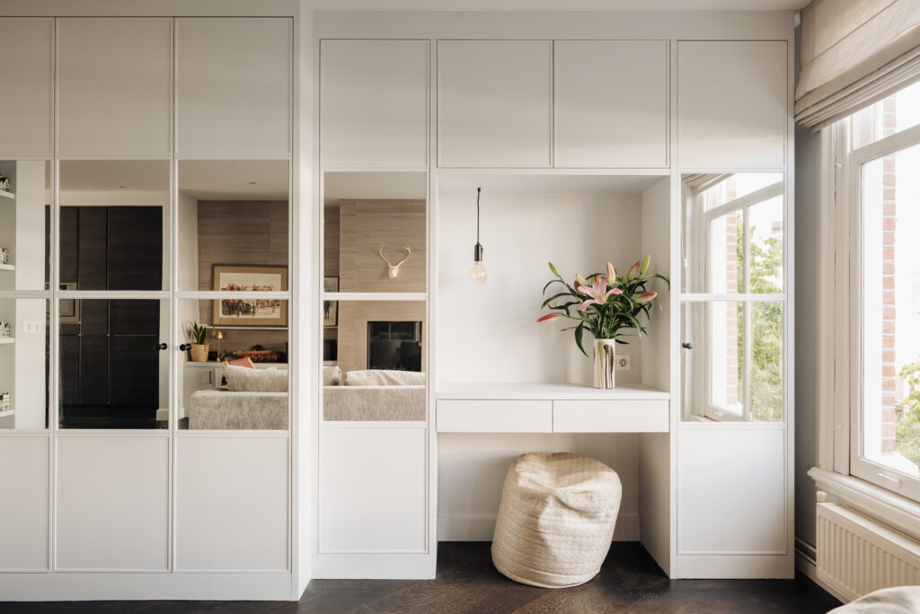 De dubbele stoere stalen deuren scheiden het trappenhuis en hal met toilet, een statement naar de living. De living is over de gehele derde verdieping met aan de voorzijde het zitgedeelte met sfeervolle gashaard. Aan de zijkant is er een op maat gemaakte kastenwand geplaatst met een bureau. Een perfecte werkplek.