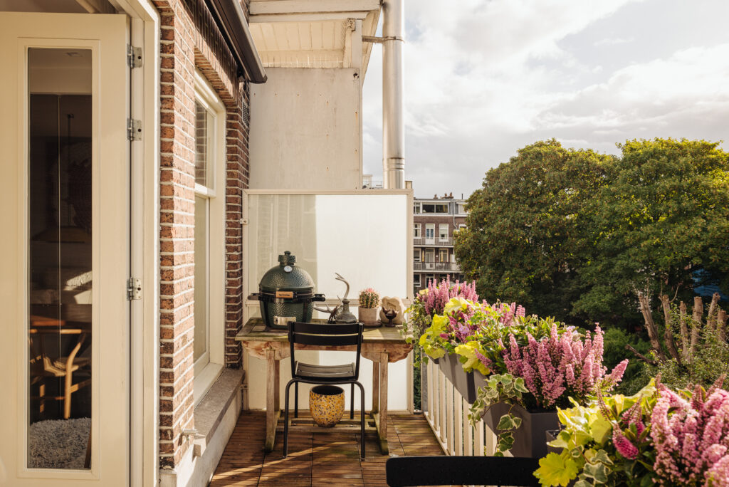 Aan de achterzijde, grenzend aan het eetgedeelte is het ruime terras. Het terras van circa 8 m² ligt op het zuiden en is een waar verlengstuk van de living. De openslaande deuren staan bij een klein beetje zon al open en maakt dit terras tot een zeer kwalitatieve buitenruimte. De automatische zonnewering, geplaatst in 2021, zorgt voor schaduw.