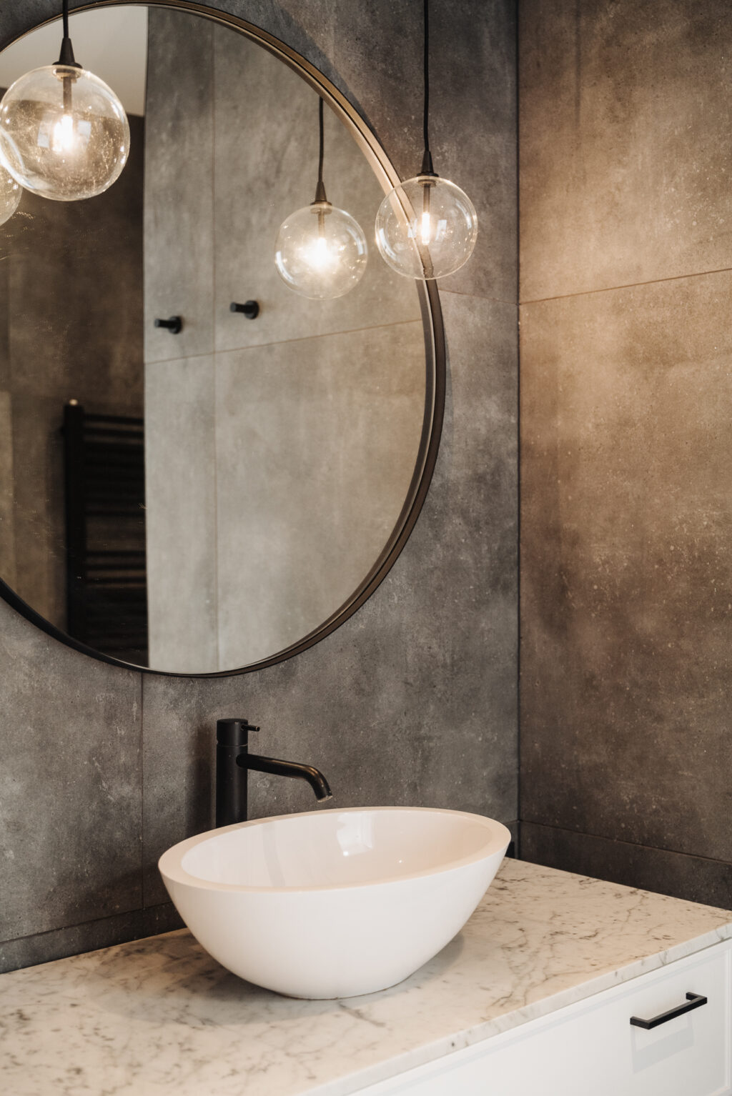 De luxe en eigentijdse badkamer is ruim opgezet met een vrijstaand ligbad, inloopdouche en maatwerk wastafel meubel.