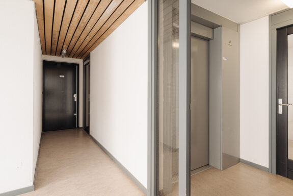 This building, designed as terraced houses, takes the task of creating ground-level homes with individual front doors quite seriously. The result is a structure with numerous staircases and a façade adorned with doors. Each residence boasts its own staircase, with the stairwell as its central feature. As a result, the rooms within these homes are spread across various levels. The lower four levels are accessible from the ground floor, while the upper four floors are reached via a rooftop pathway on the eighth floor. Elevators are strategically placed at the building’s turning points.