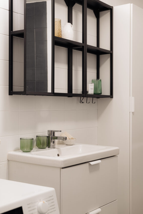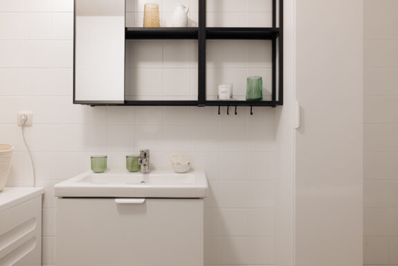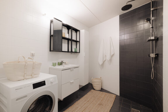 Towards the rear, you’ll discover three generously proportioned bedrooms, one of which grants access to the sunny balcony, providing panoramic views to the west. The bathroom exudes spacious simplicity. Its walls are fully tiled up to the ceiling, and there’s ample space for a washing machine. The shower is flush with the floor, and a bathroom vanity with a mirror above completes the functional yet elegant ensemble.