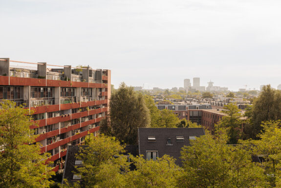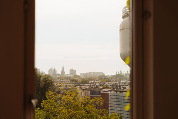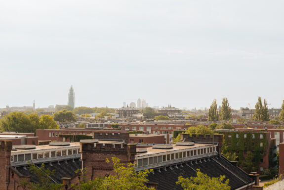 Overdag zitten we het liefst in de ruime woonkamer omdat het uitzicht vanaf de bovenste verdieping prachtig en rustgevend is. Je kijkt uit op de watertoren van het GWL terrein die omgeven is door veel groen en bomen, en daarachter kun je over de hele Jordaan uitkijken, helemaal tot Amsterdam Noord, en als je goed kijkt zie je zelfs de Johan Cruijff Arena in Zuid liggen.